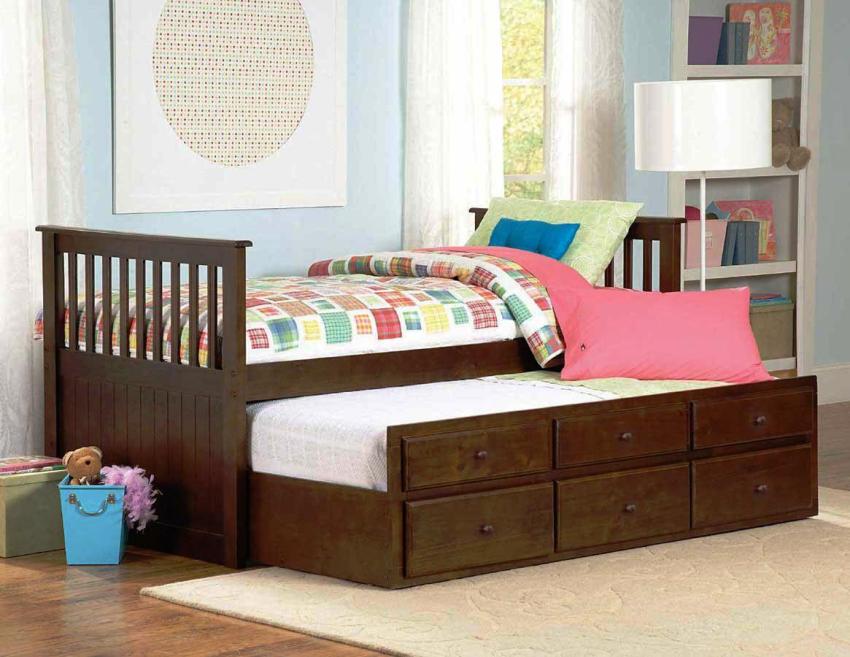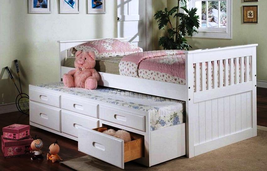 Tempat tidur lipat (pull-out) boleh menjadi pilihan yang agak murah dan mudah untuk taman asuhan kanak-kanak untuk dua orang anak. Model seperti itu paling sering dibuat dari panel berbasis kayu, hanya kerangka yang dapat dibuat dari kayu. Mereka ringan, jadi kanak-kanak dapat mengatasi tempat tidur yang boleh ditarik secara bebas. Reka bentuknya mudah alih, mudah untuk memindahkannya jika perlu. Sebagai contoh, pada musim sejuk ia boleh dipasang lebih dekat dengan elemen pemanasan, pada musim panas - ke sumber udara segar.