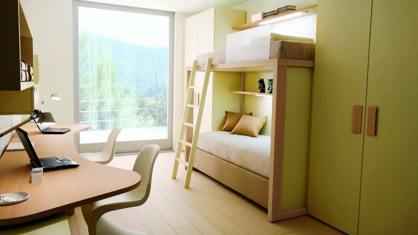Untuk menampung dua tempat tidur yang berasingan di bilik kanak-kanak, diperlukan ruang yang cukup besar (sekurang-kurangnya 24 m2), jika tidak, akan ada sedikit ruang kosong di dalamnya. Jenis tempat tidur yang lain harus dicirikan sebagai model dengan mana anda dapat mengurangkan kawasan bilik dengan ketara untuk mengatur tempat tidur.
