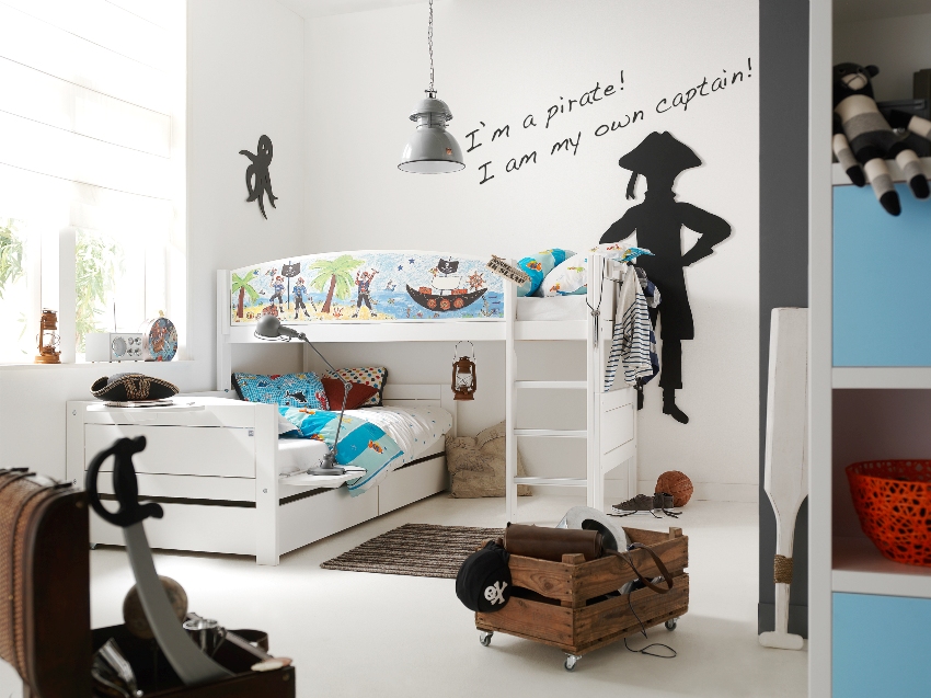 Salah seorang kanak-kanak mungkin tidak menyukai katil loteng, dan yang lain akan senang tidur di tingkat atas. Kita perlu mencari jalan untuk menampung dua katil yang berbeza. Sekiranya perabot dibuat dari bahan yang sama dan dengan gaya yang sama, ini hanya akan menambah keselesaan di dalam bilik. Perkara yang sama tidak selalu baik. Sekiranya kita mengambil kira bahawa bilik ini dilengkapi untuk kehidupan anak-anak yang selesa, dan bukan sebagai ruang pameran, tidak ada salahnya untuk menumpukan perhatian pada perkara ini.