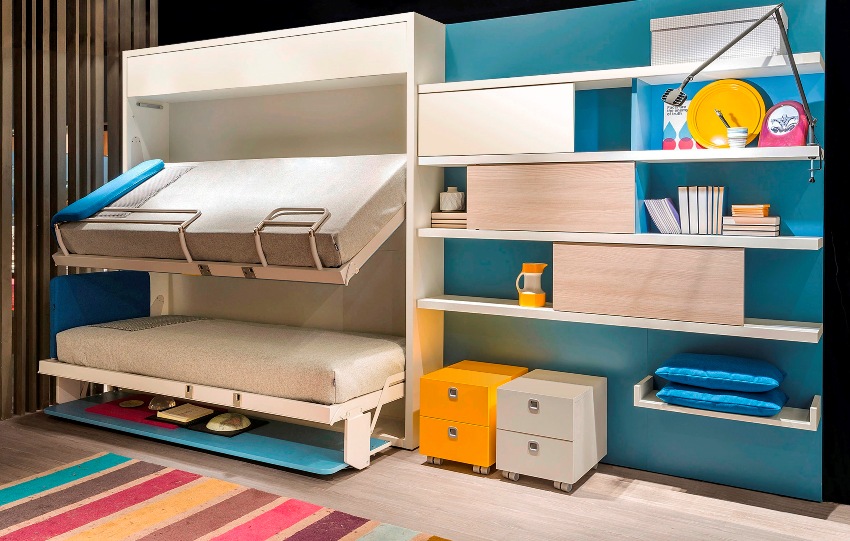 Tempat tidur lipat berani, kreatif, bergaya. Bilik kanak-kanak yang tidak rapi kondusif untuk pembebasan, kebebasan, kreativiti, pendidikan jasmani. Sekiranya kawasannya sangat kecil, maka ini adalah pilihan yang tidak dapat diganti. Tempat tidur ini terdapat dalam dua jenis tempat duduk:
