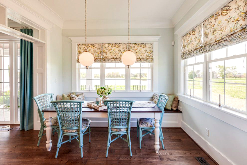 Di dapur, bilik mandi dan lorong, penggunaan perabot rotan adalah mungkin kerana ketahanan terhadap kelembapannya. Sistem penyimpanan terutamanya berlaku di sini: kabinet, bakul, rak. Di dapur atau di ruang makan, ruang makan dilengkapi dengan kerusi rotan kerana kemudahan, ringan dan kombinasi yang indah dengan meja kayu yang kukuh. Reka bentuk kerusi memberikan banyak pilihan untuk mengatur pelbagai bahagian dalam, ini difasilitasi oleh variasi ketinggian dan lenturan belakang, kehadiran sandaran tangan, teknik tenun, dan banyak lagi.