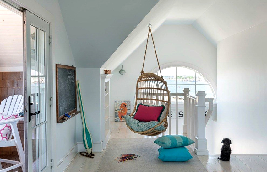 Sekiranya ruang mengizinkan, jalan keluar yang baik adalah memasang kerusi goyang, sofa anyaman bujur, Mamasan, atau kerusi berlengan Papasan yang besar pada anak. Perabot seperti itu akan menarik minat kanak-kanak dan remaja. Lengkapkannya dengan bantal hiasan atau penutup yang sesuai dengan gaya keseluruhan untuk bahagian dalaman eksklusif untuk taman asuhan kanak-kanak.