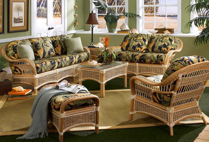 Sofa paling sering dimasukkan ke dalam set perabot rotan dalam ensemble dengan kerusi berlengan dan meja kopi. Sofa dengan tenunan yang berbeza dipilih untuk bahagian dalaman yang berbeza. Perabot warna terang sesuai untuk gaya Victoria, untuk klasik dan minimalis - dengan tenunan berterusan, dan Art Deco akan memerlukan gaya yang ketat tanpa hiasan dan warna gelap.