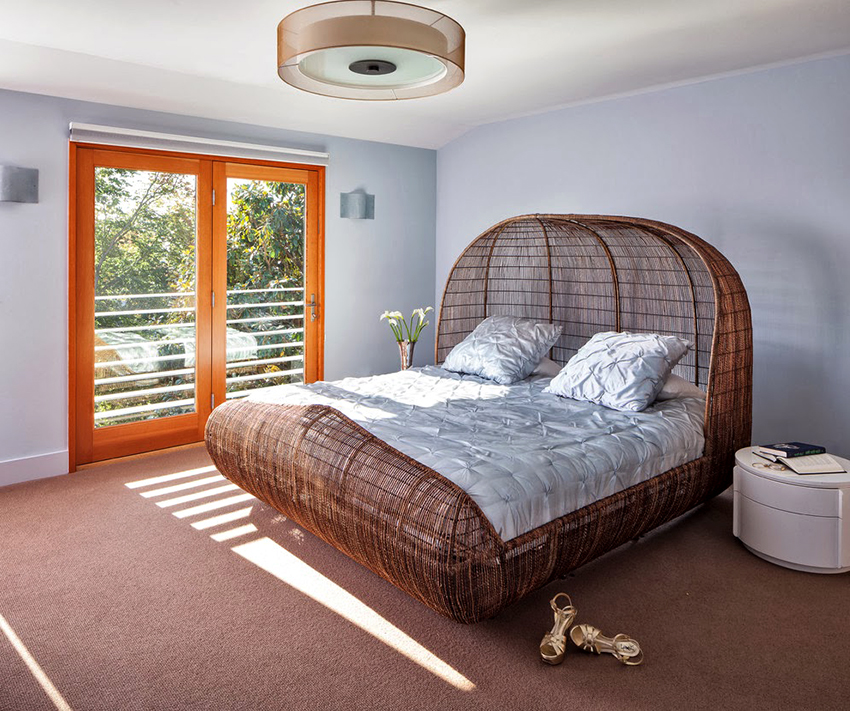 Tempat tidur dengan bentuk yang tidak biasa, terbuat dari rotan semula jadi, akan menjadi hiasan utama bilik tidur