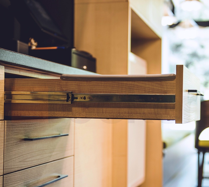 Pembinaan boleh dilengkapi dengan penutup dan peredam.Elemen pertama digunakan untuk menutup laci dengan lancar. Ia diaktifkan pada titik tertentu. Peredam menyumbang kepada penutupan yang lancar dan senyap. Mereka bertindak sebagai penyerap kejutan jika daya yang berlebihan dikenakan pada kotak semasa proses penutupan. Slaid untuk laci dengan lebih dekat dicirikan oleh tahap kebolehpercayaan yang tinggi, keupayaan untuk menahan beban yang ketara, ketahanan dan kemudahan penggunaan.
