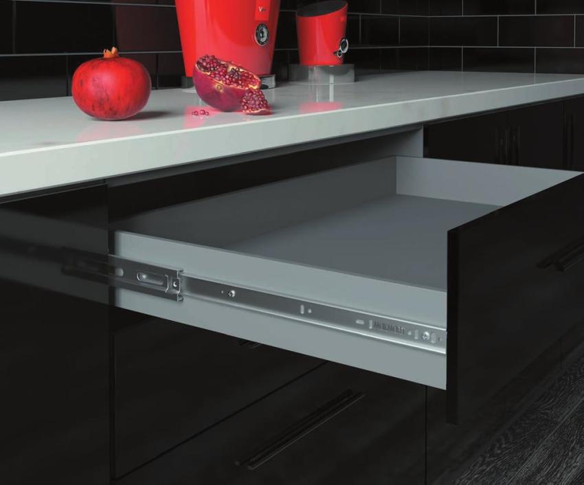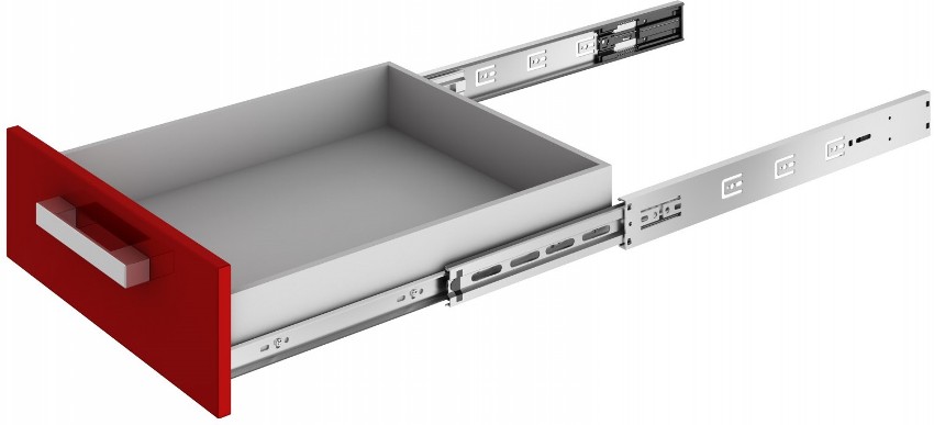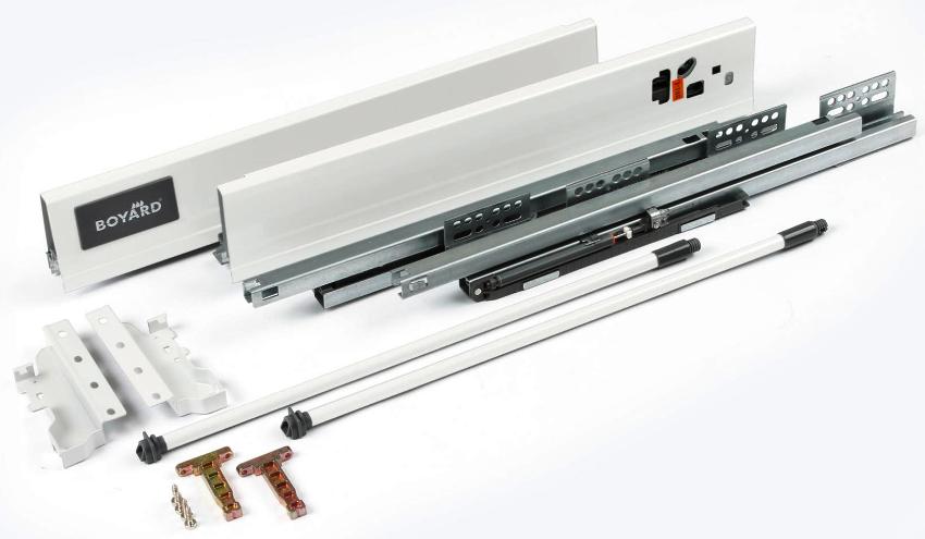 Pergerakan dihasilkan dengan ketinggian sisi laci 68 dan 83 mm. Setiap set terdiri daripada dua panel sisi, dua rel, penutup hiasan, pemegang untuk panel belakang dan pengikat di bahagian depan.