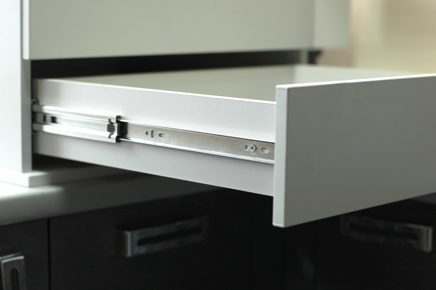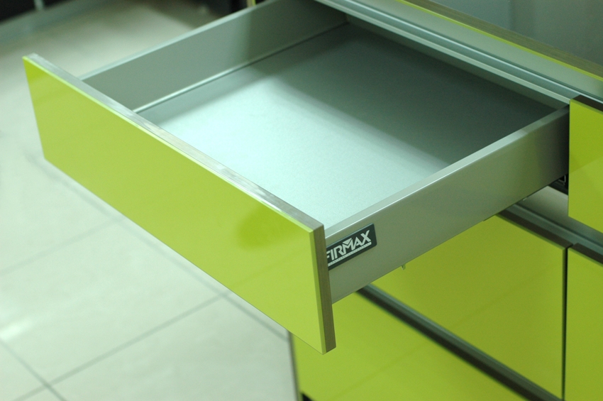 Di antara alat kelengkapan baru untuk laci, seseorang dapat membezakan metabox dan tandembox, yang dipersembahkan oleh struktur siap dengan dinding logam, di mana panduan bola atau roller dibina.
