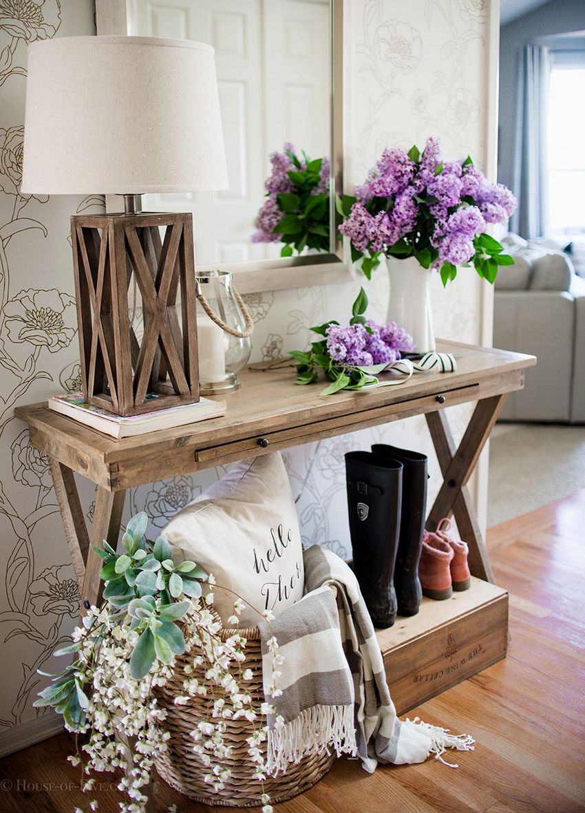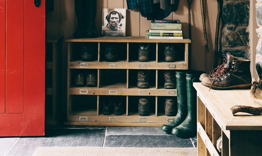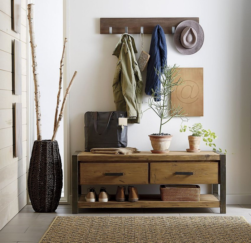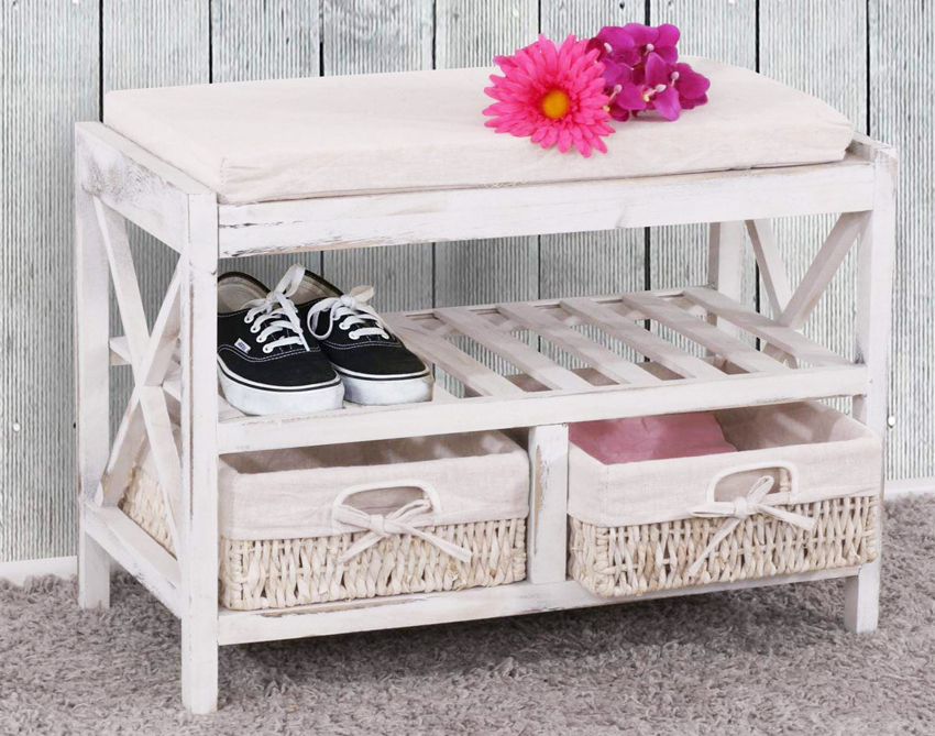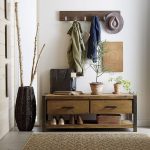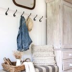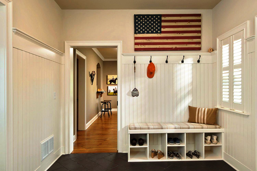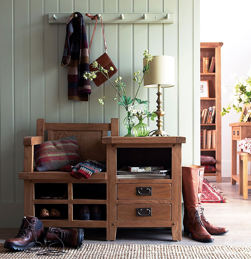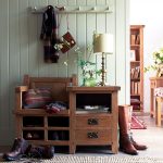 Ciri-ciri rak untuk kasut di lorong, dihiasi dengan gaya desa atau chic lusuh