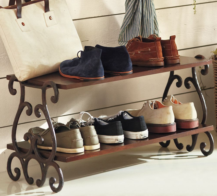 Rak kasut kayu adalah struktur yang boleh dipercayai yang mesti dirawat dengan bahan khas yang melindungi dari kelembapan dan perubahan suhu secara tiba-tiba ketika membuka pintu depan. Rak kasut logam kelihatan asli dan harmoni digabungkan dengan elemen kayu dan tekstil.