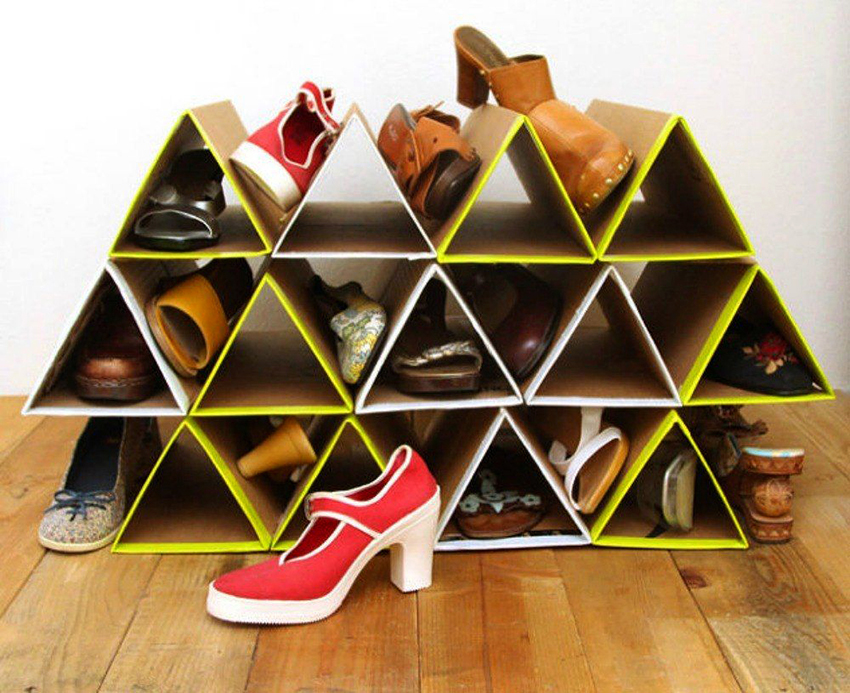 Pertimbangkan beberapa pilihan menarik dan ringkas untuk reka bentuk kasut. Yang paling mudah ialah rak yang diperbuat daripada kotak kadbod. Peranti ini murah dan senang dihasilkan, dan yang paling penting, ia memerlukan sedikit masa untuk berfungsi. Walau bagaimanapun, produk ini juga mempunyai kekurangan: tidak boleh dipercayai dan sama sekali tidak sesuai jika terdapat haiwan kesayangan.