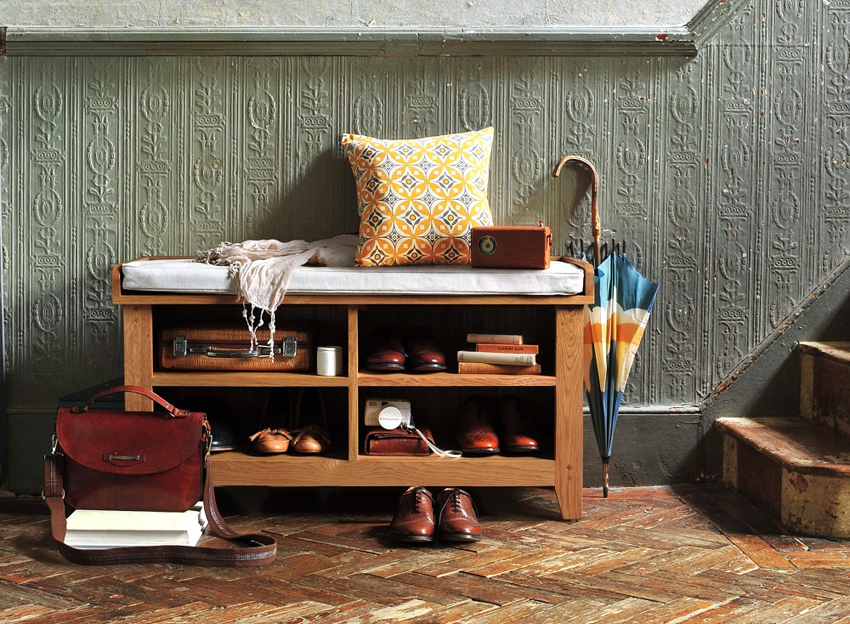 Rak kasut kayu dengan tempat duduk lembut yang dipangkas dengan kain katun dengan corak bunga atau bintik kecil akan kelihatan cantik. Juga, permukaan kayu alat tersebut boleh dihiasi dengan corak bunga (menggunakan teknik decoupage).