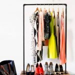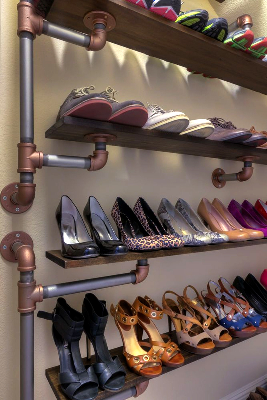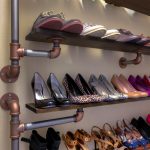 Masalah utama premis pangsapuri adalah kekurangan ruang. Salah satu kaedah menjimatkan ruang dan penyimpanan kasut wanita dengan tumit nipis yang optimum adalah dengan menggunakan paip logam. Untuk melakukan ini, pegangan tangan panjang mesti dilekatkan pada jarak 5 cm dari dinding. Dalam kes ini, kasut akan dipegang oleh tumit. Sekiranya anda merancang rak sedemikian dengan cantik, maka reka bentuknya akan kelihatan sangat asli.