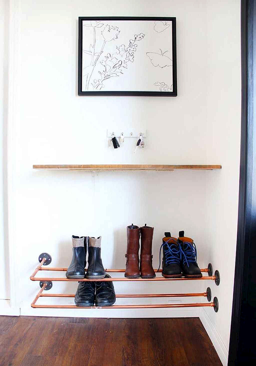 Rak dinding untuk kasut di lorong adalah pilihan terbaik untuk lorong kecil atau koridor, kerana produk ini ringan dan cetek, tetapi model seperti itu tidak sesuai untuk kasut besar. Sangat mudah untuk membuat rak dengan tangan anda sendiri. Untuk melakukan ini, anda hanya memerlukan beberapa papan dan pengikat logam. Tangan yang mahir akan dapat menjadikan paip logam biasa menjadi sorotan dalaman.