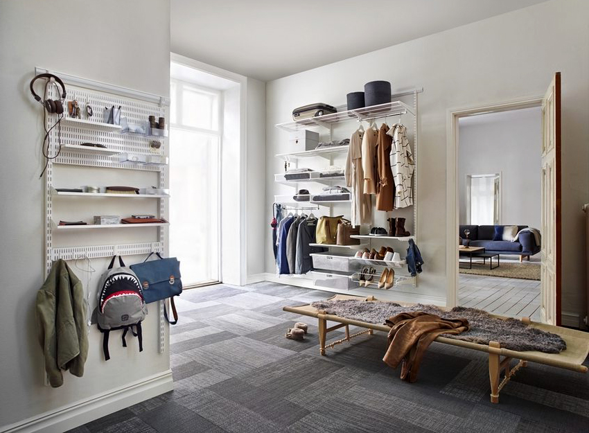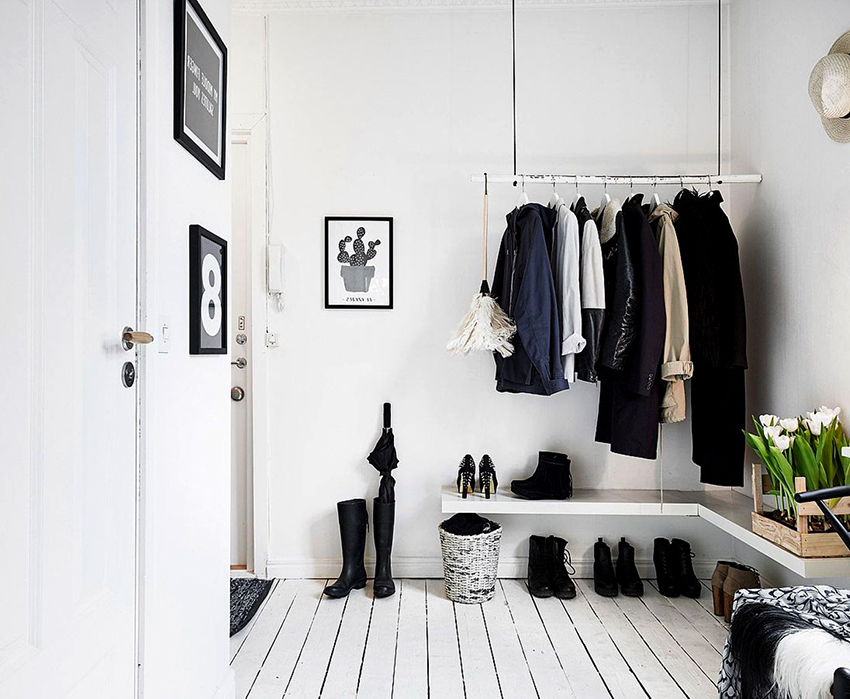 Sekiranya terdapat lorong yang padat, anda boleh memasang pemegang kasut kecil atau memilih satu set tong gantung. Struktur sedemikian tidak akan mengambil ruang di lantai, dan jika perlu, mudah untuk meletakkannya lebih tinggi atau menurunkannya. Anda juga dapat menjimatkan ruang di dalam bilik dengan memasang dudukan dinding.