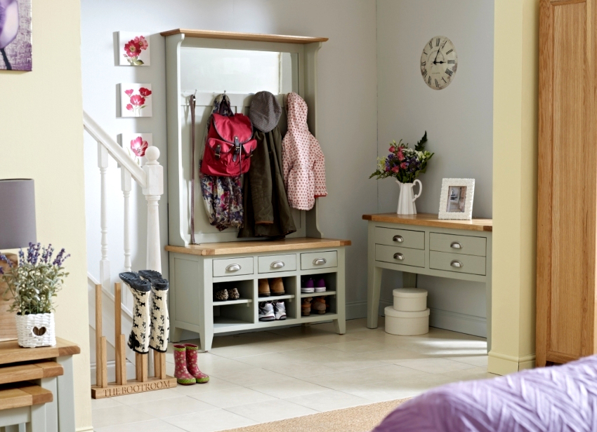 Rak boleh digabungkan dengan tempat duduk dengan sandaran atau penyangkut mantel di bahagian atas. Bahannya, dicat dengan warna yang diredam dengan kesan terbakar di bawah sinar matahari, kelihatan sangat cantik dan bergaya: hijau, pirus, coklat, lavender, terakota atau putih. Selalunya dalam reka bentuk bilik gaya Provence, rak terbuka dalam bentuk kotak anyaman digunakan untuk menyimpan kasut.