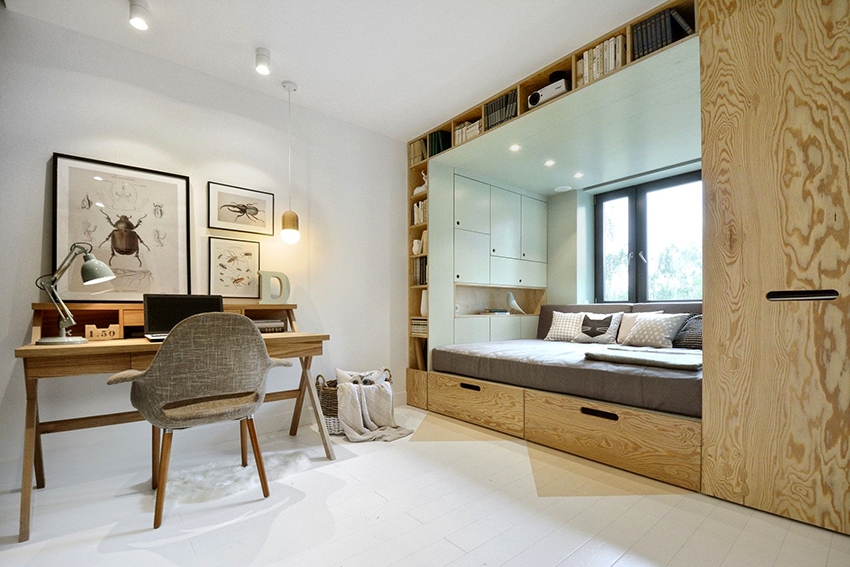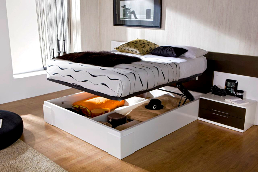 Untuk bilik kecil, lebih baik memberi keutamaan kepada katil yang dilengkapi dengan mekanisme mengangkat.