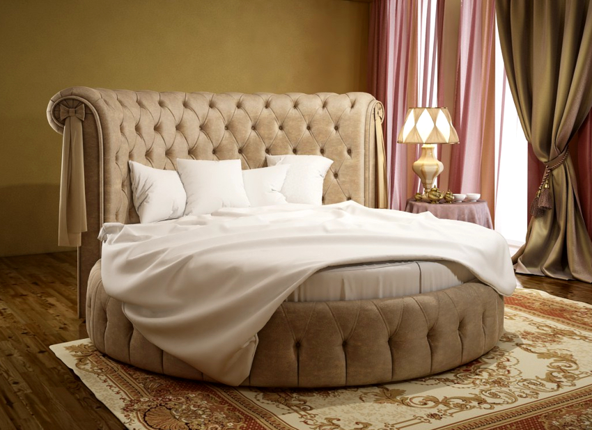 - Tempat tidur bulat, yang dianggap paling popular di antara bentuk yang tidak standard. Di sini harus diingat bahawa ukuran satu tempat tidur sesuai dengan diameter 2 meter, dan satu setengah produk dapat diganti dengan tempat tidur bulat, diameternya 210 cm.