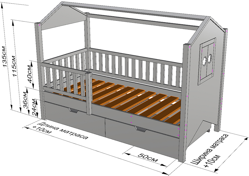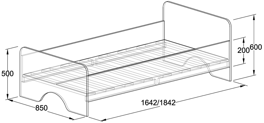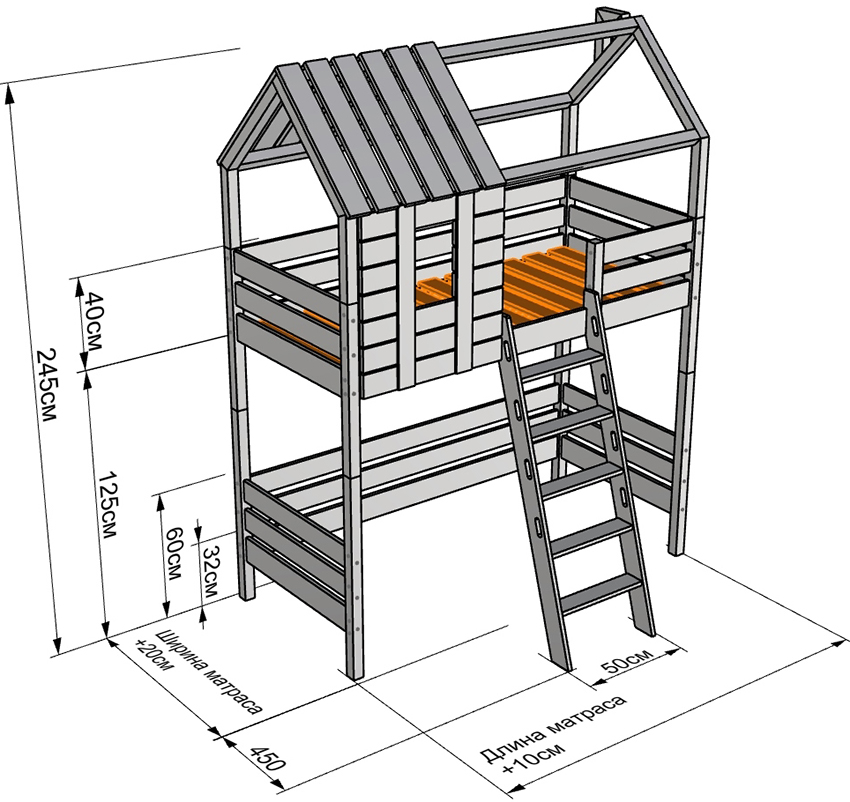 Ketinggian struktur mencapai 1.5 meter, dan ukuran tempat tidur biasanya 80 x 190 cm. Sekiranya sebuah bilik kecil disediakan untuk seorang remaja, pilihan terbaik untuk mengatur tempat tidur adalah tempat tidur kerusi lipat, ukurannya dalam keadaan yang tidak dilipat sesuai dengan standard 90 hingga 200 cm.