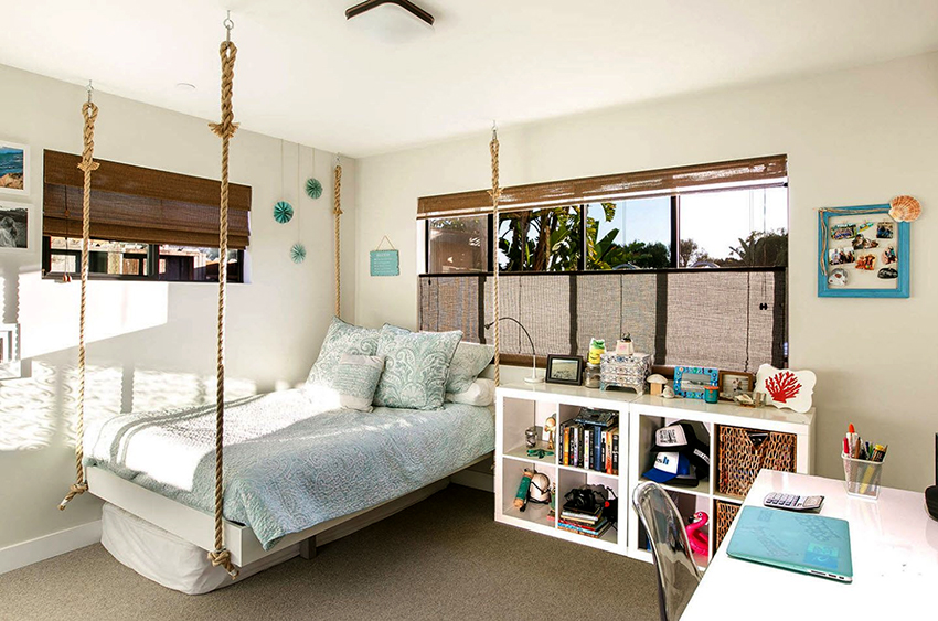 - Model yang digantung. Untuk membuat pilihan ini, sebuah katil single dengan parameter 80-100 cm lebih sesuai, atau sebuah lori kecil satu setengah hingga lebar 140 cm, panjang dalam kes ini tidak begitu penting. Kelemahan utama adalah bahawa katil menjadi longgar dengan cepat. Dilampirkan ke dinding dengan kabel, tali atau rantai.