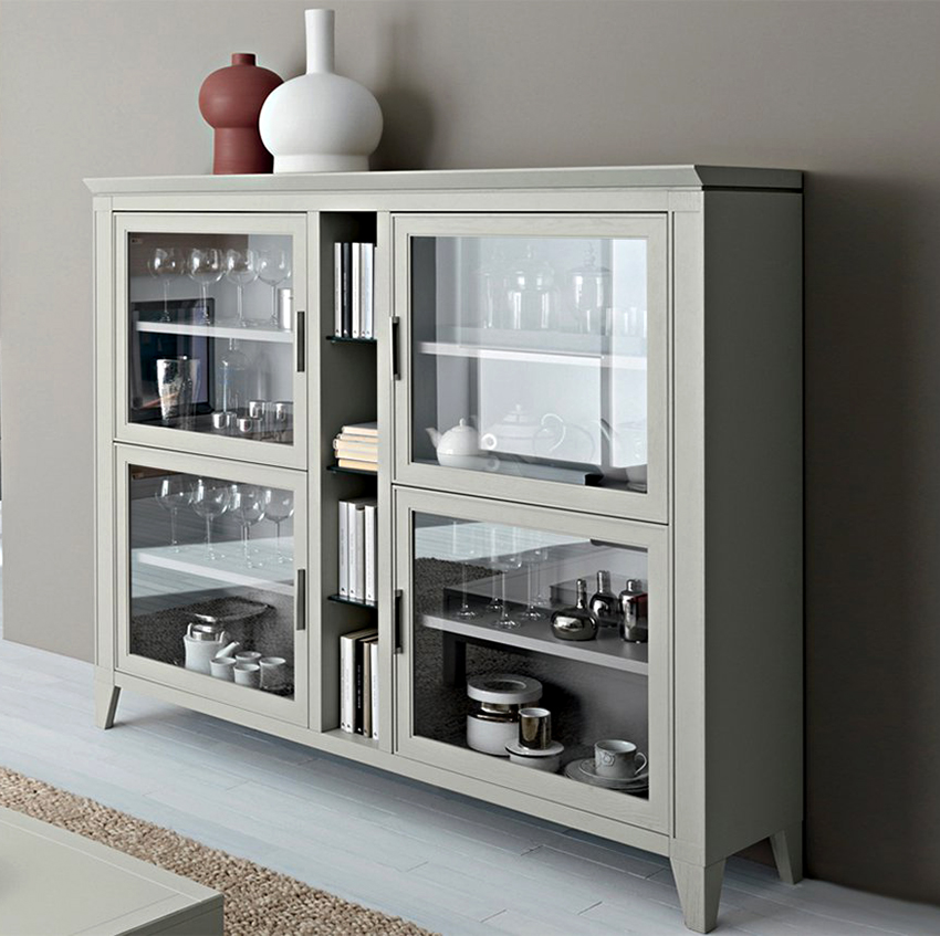 Almari kaca moden adalah perabot mandiri yang dipasang di ruang makan atau ruang tamu di mana ia adalah kebiasaan untuk menerima tetamu. Ia berfungsi bukan hanya sebagai hiasan dalaman, tetapi juga sebagai barang keperluan rumah, di mana semua barang yang diperlukan ada di tangan. Dengan reka bentuknya, almari terdiri dari dua bahagian, di mana bahagian atasnya biasanya berkaca, dan bahagian bawahnya dilengkapi dengan pintu kosong.Walau bagaimanapun, anda boleh menemui model kaca sepenuhnya.