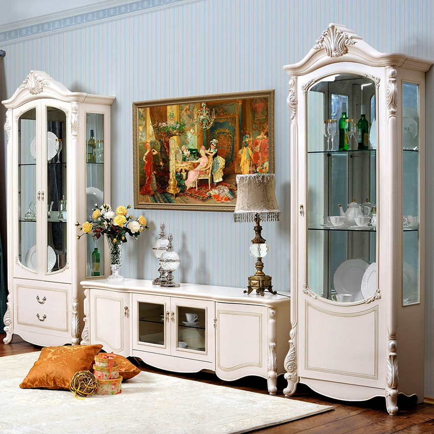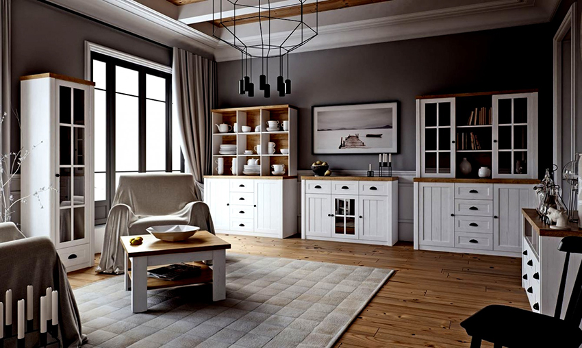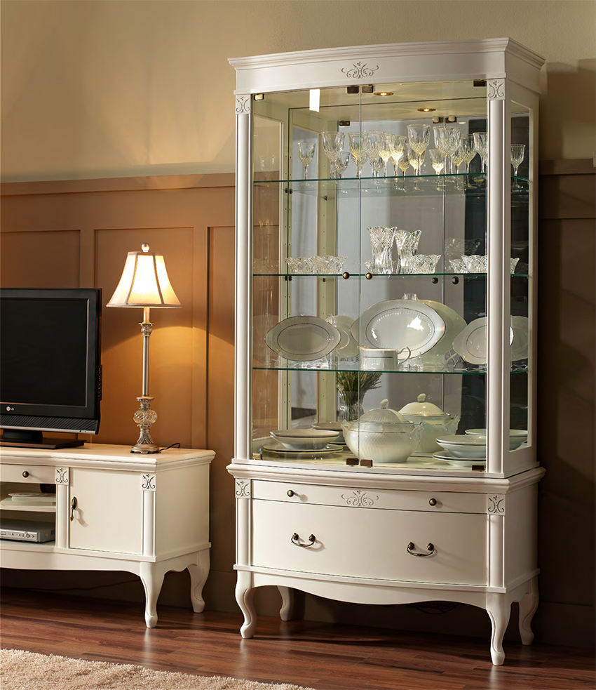 Untuk ruang tamu di gaya Provence, Scandi dan Shabby yang bergaya, anda harus memilih papan buih untuk hidangan dengan warna terang. Pilihan yang sangat baik untuk ruang tamu yang luas adalah almari pakaian putih tinggi dengan pintu kaca dan banyak rak. Untuk bilik kecil, lebih baik memilih papan sisi sudut kecil dengan satu pintu.