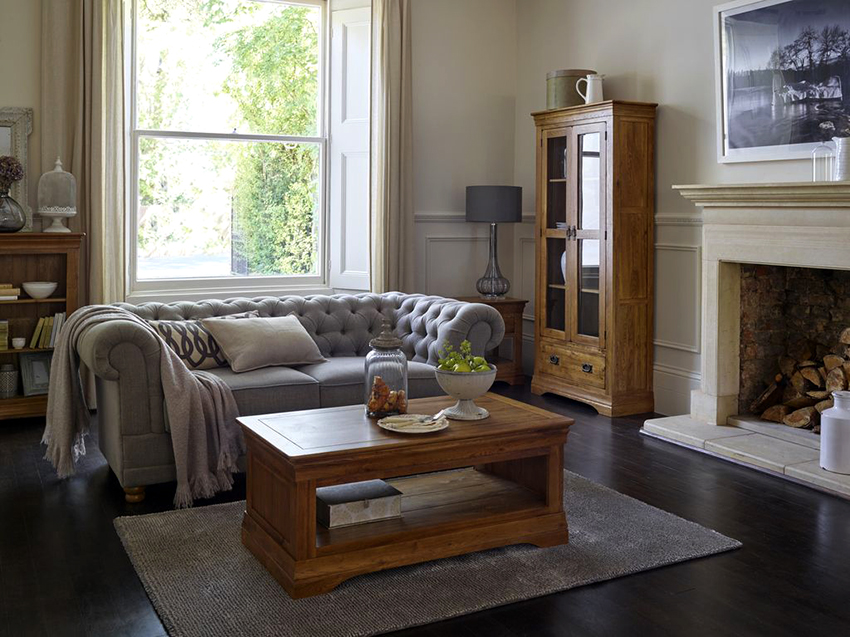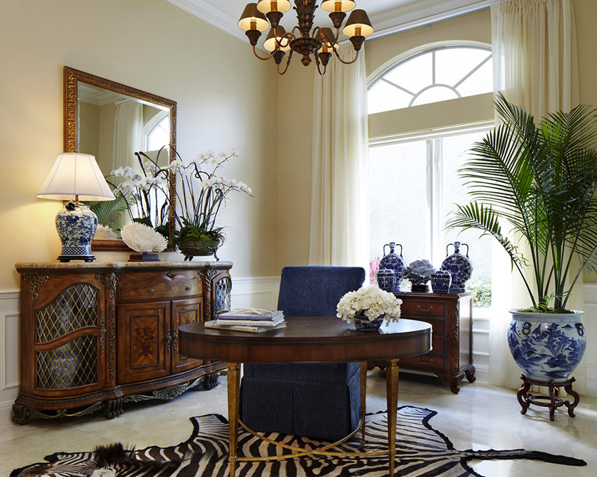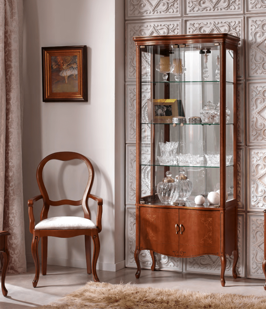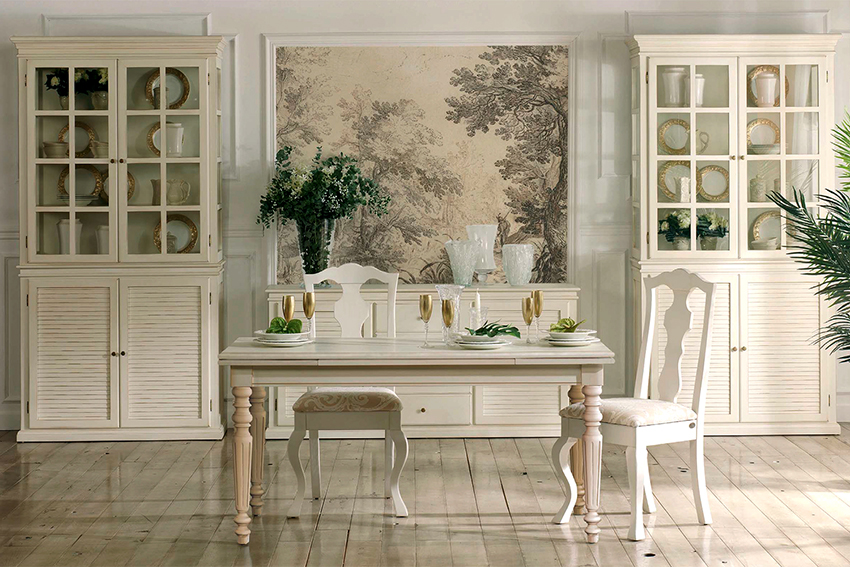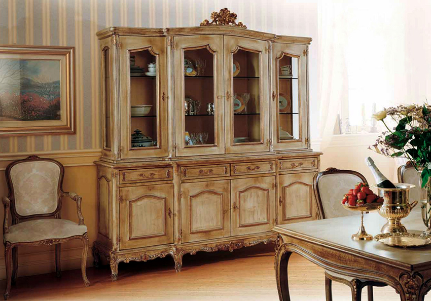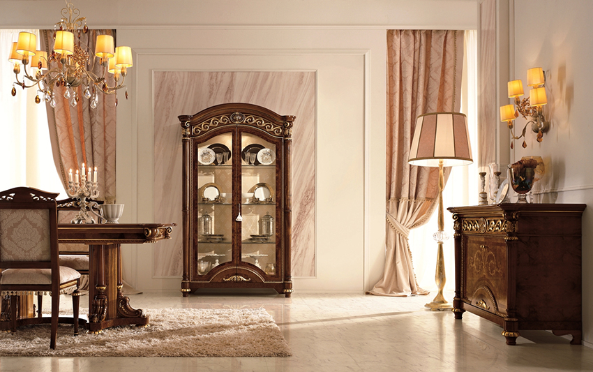 Perabot klasik adalah bentuk besar dan kayu berharga. Dalam gaya istana seperti Baroque dan Rococo, kehadiran bahan semula jadi, unsur ukiran, penyepuhan, batu dan kaki diukir adalah wajib. Untuk gaya ini, dan juga untuk negara dan Provence, elemen vintaj adalah ciri khas, hiasan decoupage dan lukisan tangan digunakan.