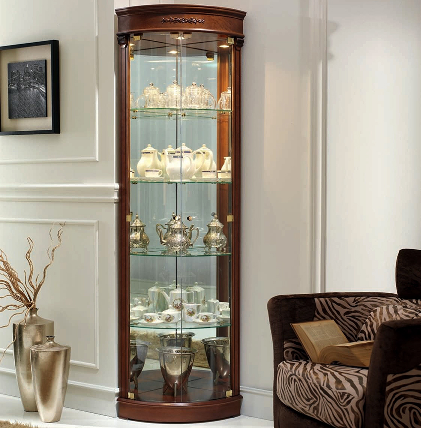 Model sudut yang dilengkapi dengan satu pintu tinggi adalah pilihan yang agak popular untuk kabinet paparan di pedalaman moden. Perabot sedemikian sangat sesuai untuk ruang kecil.