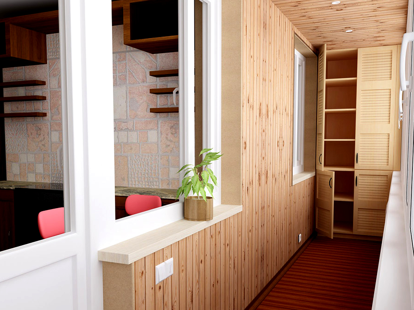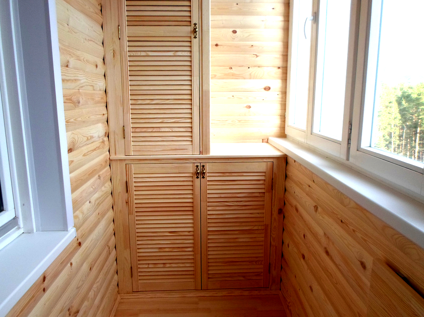 Dalam kes ini, lapisan kayu dengan lebar 5-6 cm digunakan. Kabinet buatan sendiri yang terbuat dari lapisan di balkoni akan kelihatan sesuai apabila seluruh ruangan dihiasi dengan gaya yang serupa. Kelebihan pintu plastik adalah: