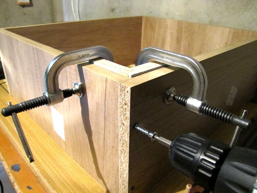 Pada langkah seterusnya, palang mendatar pertengahan dipasang di sepanjang garis pra-tanda, yang kemudian akan digunakan untuk meletakkan dan memperbaiki rak. Pemasangan mendatar juga meningkatkan ketegaran keseluruhan kabinet. Palang dipasang menggunakan skru dan sudut penoreh sendiri, yang dipasang pada bahagian bawah palang melintang.