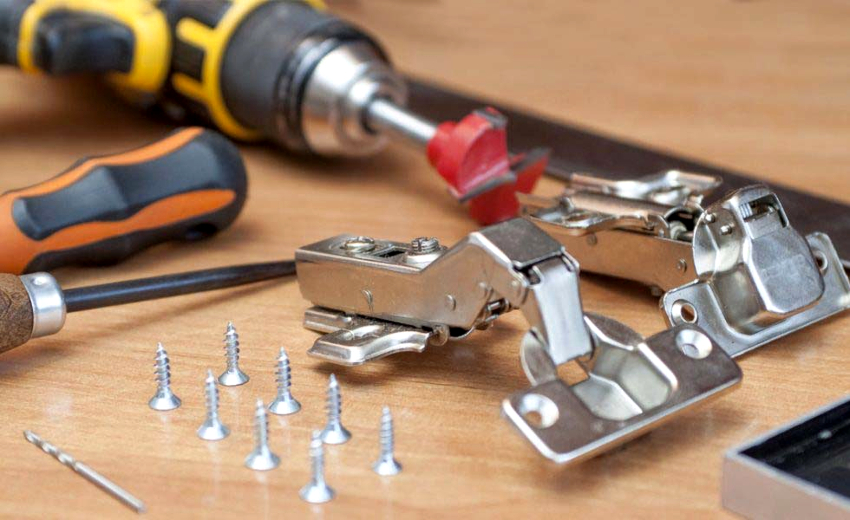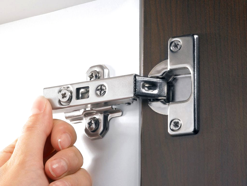 Sekiranya papan serpihan dipilih untuk pembuatan kabinet, engsel perabot dengan alur bulat digunakan untuk memasang pintu, di mana mangkuk bahagian kemudian dipasang. Lubang engsel digerudi dengan muncung khas yang dipasang pada pemutar skru atau gerudi. Apa pun engsel yang dipilih, mereka terpasang pada dinding kabinet menggunakan skru penoreh sendiri, untuk mana lubang dengan diameter lebih kecil disiapkan terlebih dahulu.