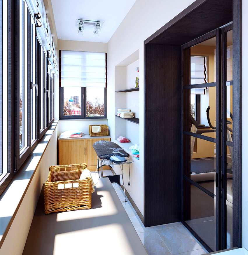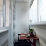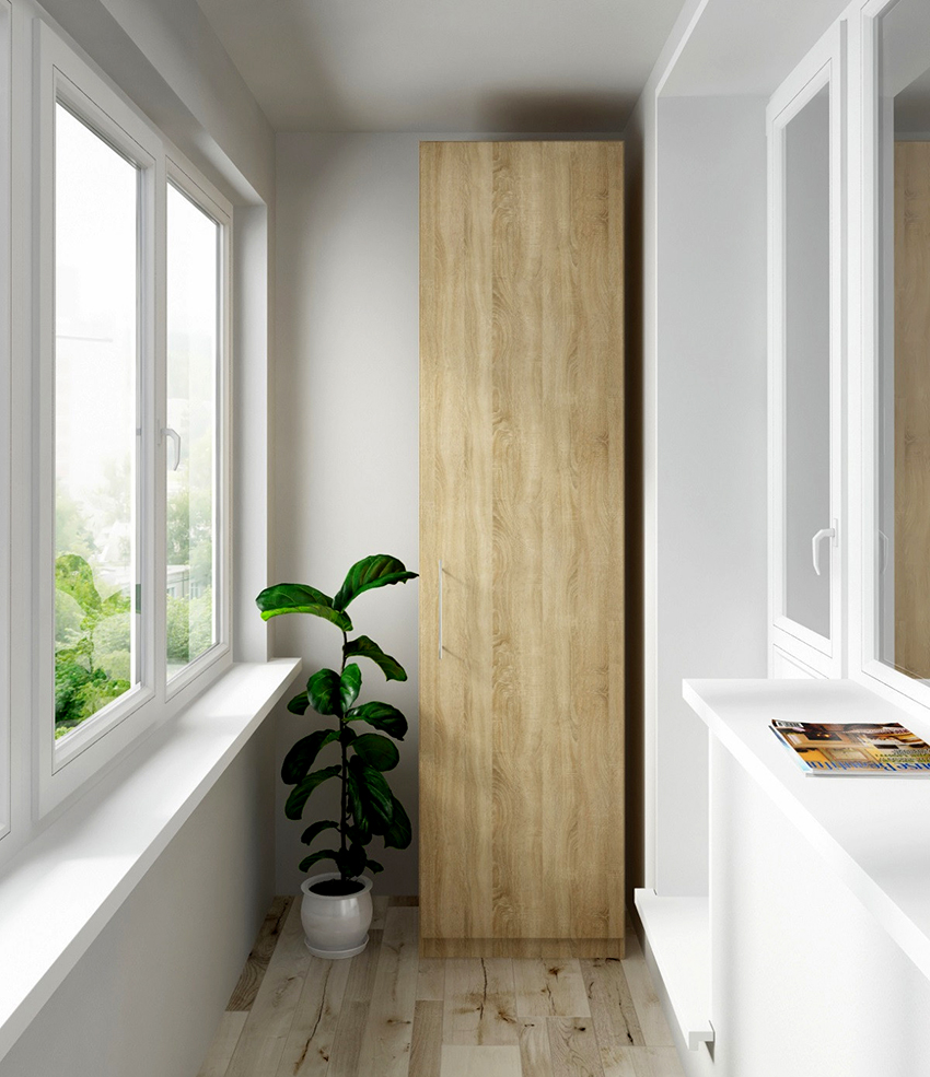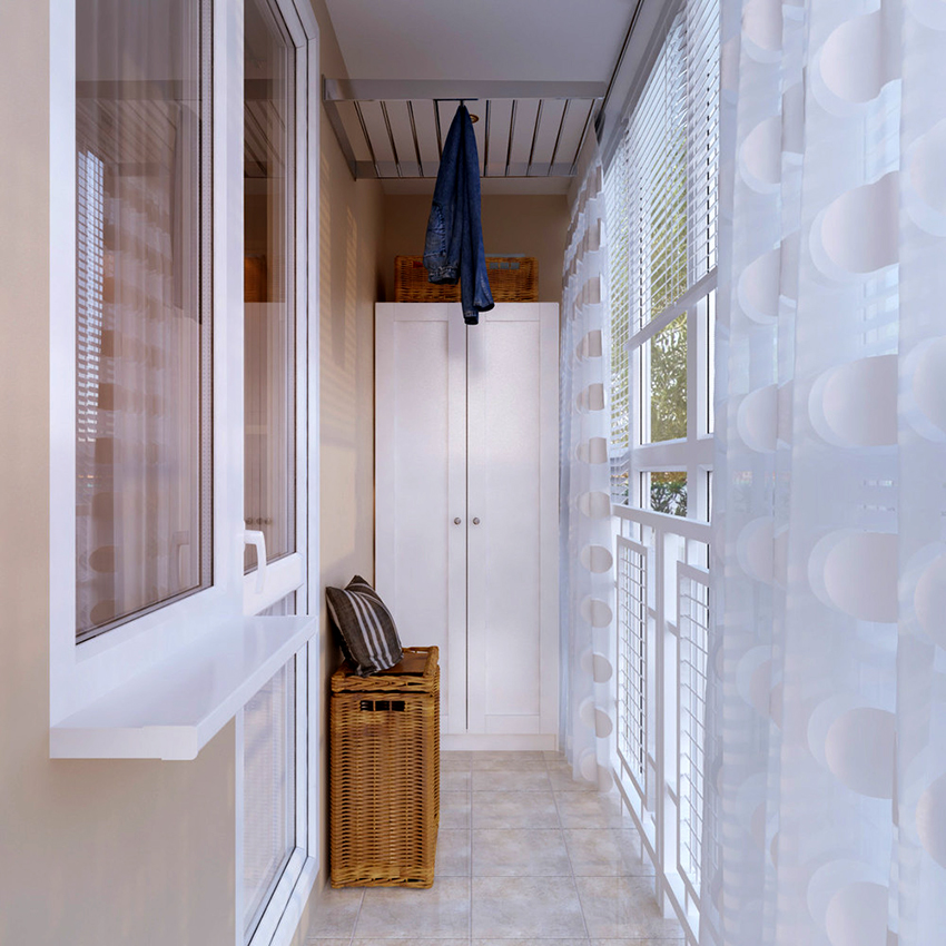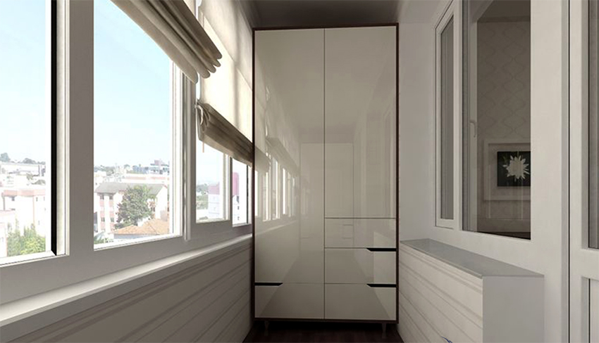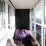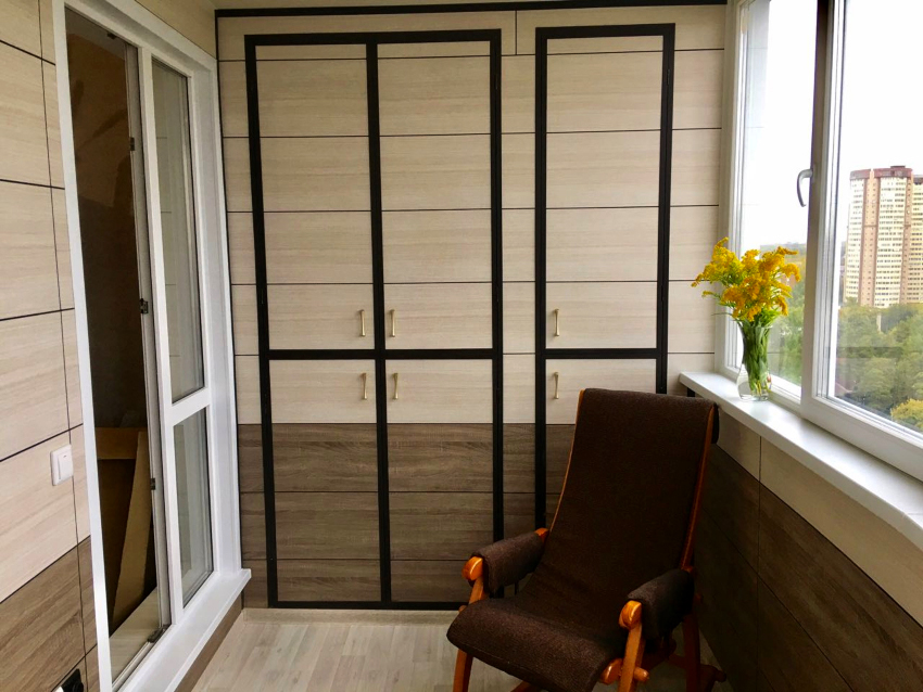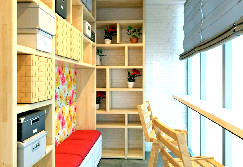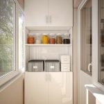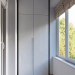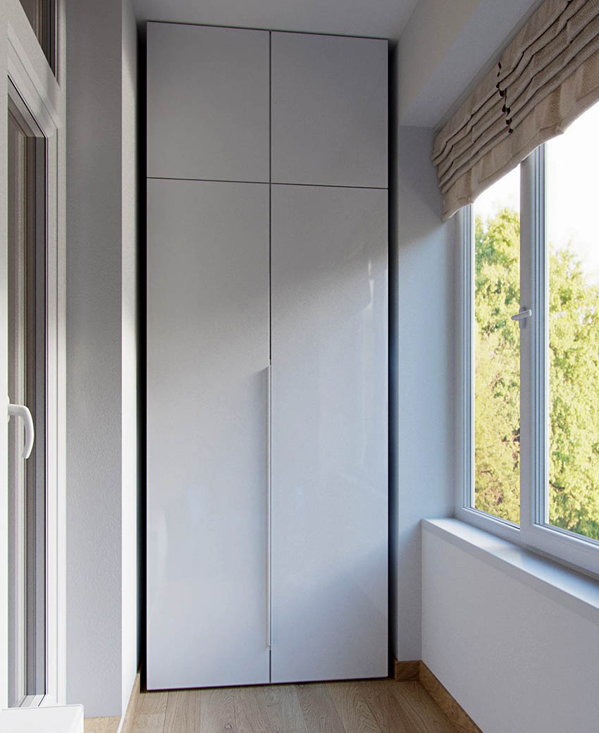 Almari yang luas di dalam bilik mewujudkan ruang simpanan tambahan untuk pelbagai barang, yang memungkinkan untuk mengosongkan ruang di apartmen. Pada masa yang sama, balkoni tidak kehilangan daya tarikannya malah memperoleh penampilan yang lebih kemas dan rapi.
