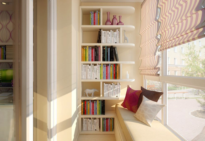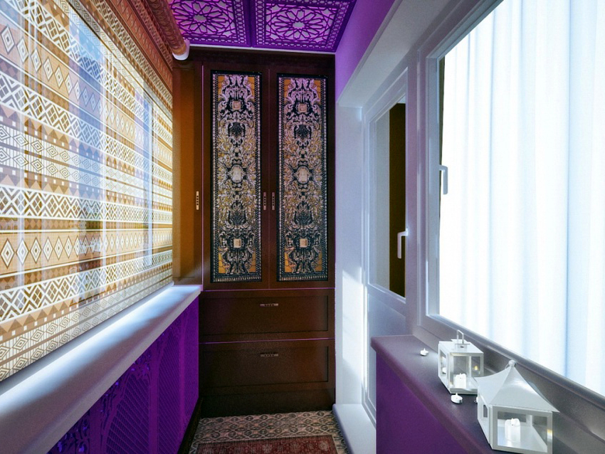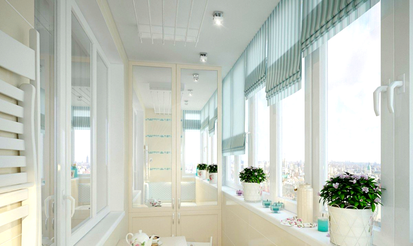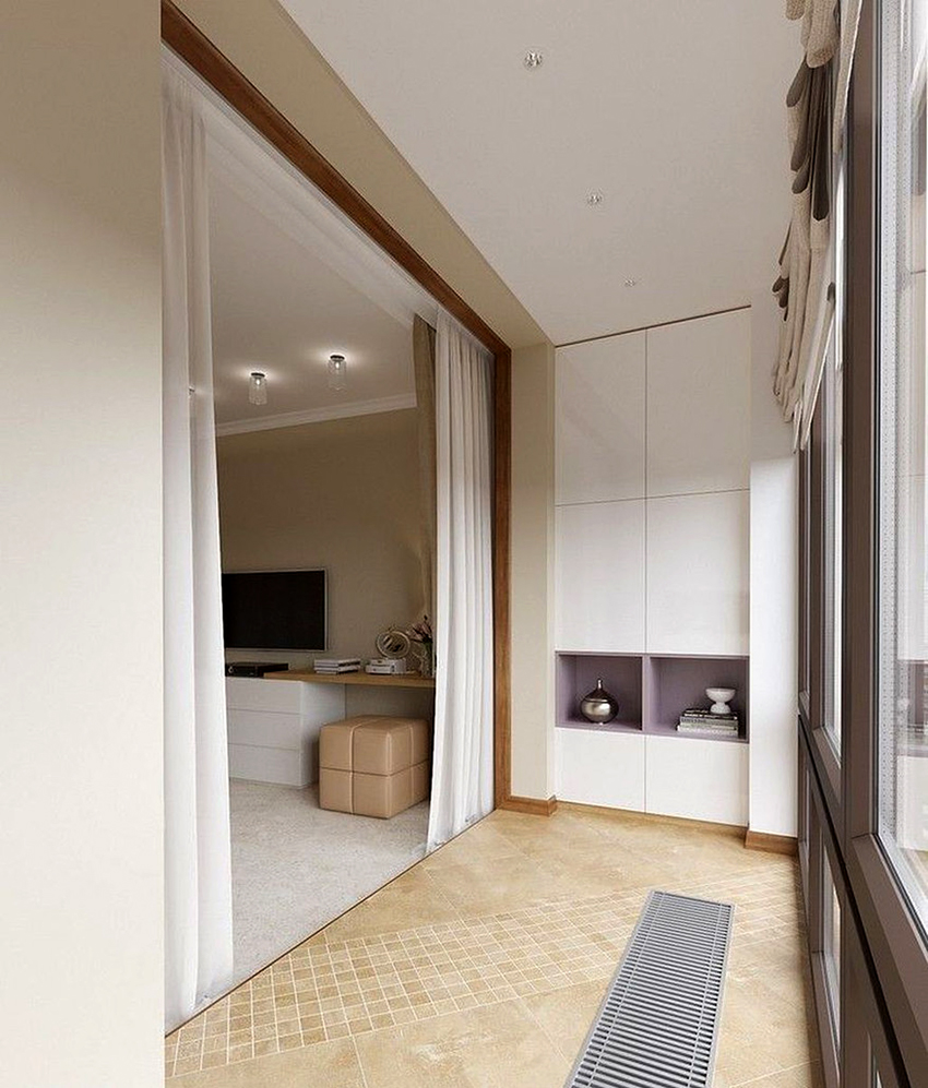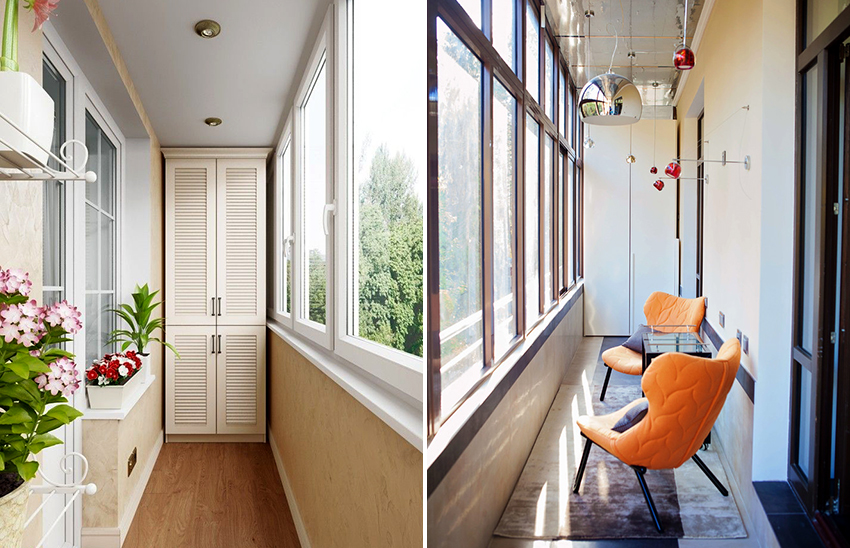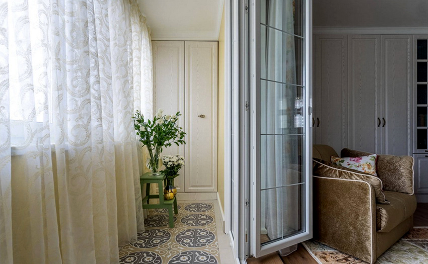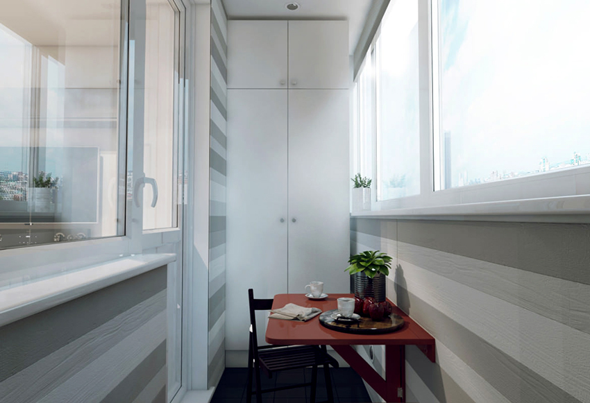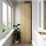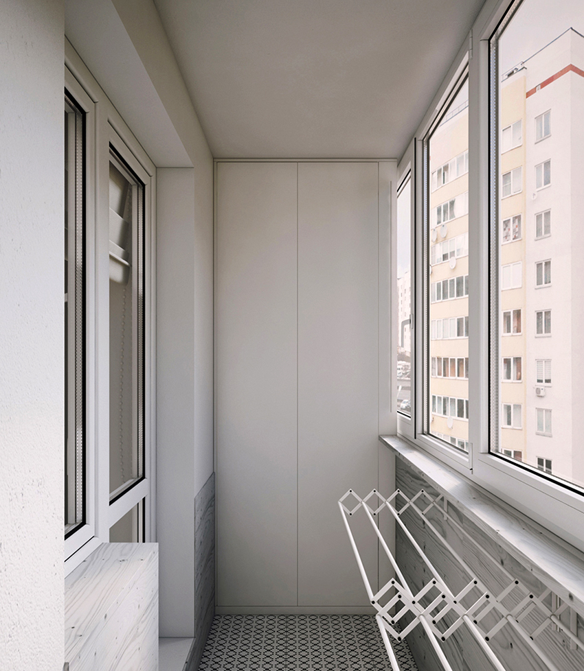 Almari yang luas di dalam bilik mewujudkan ruang simpanan tambahan untuk pelbagai barang, yang memungkinkan untuk mengosongkan ruang di apartmen. Pada masa yang sama, balkoni tidak kehilangan daya tarikannya malah memperoleh penampilan yang lebih kemas dan rapi.