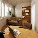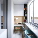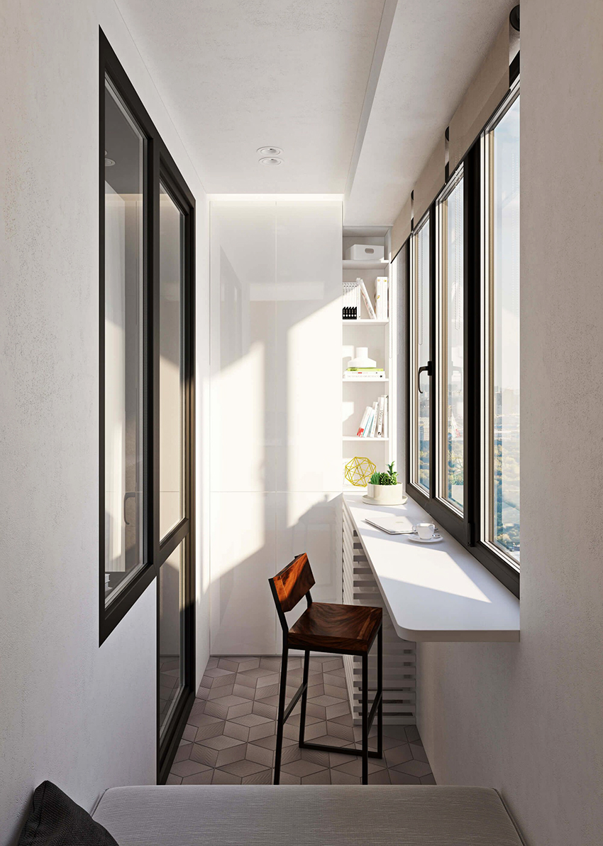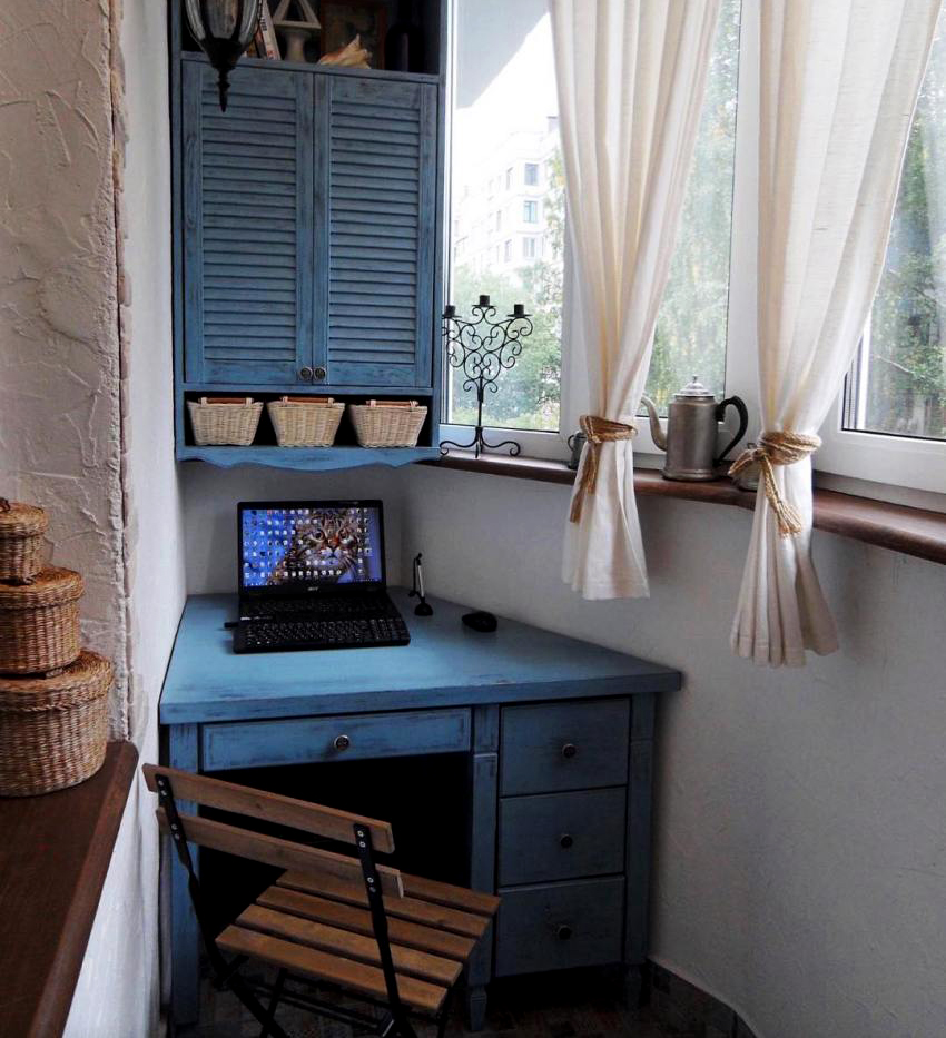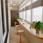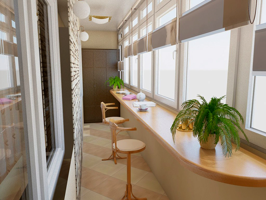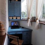 Sekiranya anda tidak mahu mengisi ruang dengan almari pakaian yang besar, anda boleh mengehadkan diri untuk membuat kabinet sendiri untuk balkoni. Penyelesaian yang optimum adalah memasang pilihan perabot ini di bawah salah satu ambang tingkap, yang ditingkatkan jika perlu. Bahagian atas meja yang dihasilkan digunakan sama ada sebagai meja kerja atau untuk menyusun tanaman. Balkonnya penuh dengan cahaya, menjadikannya tempat yang sesuai untuk menanam bunga, dan batu curb tidak akan menyekat tingkap.