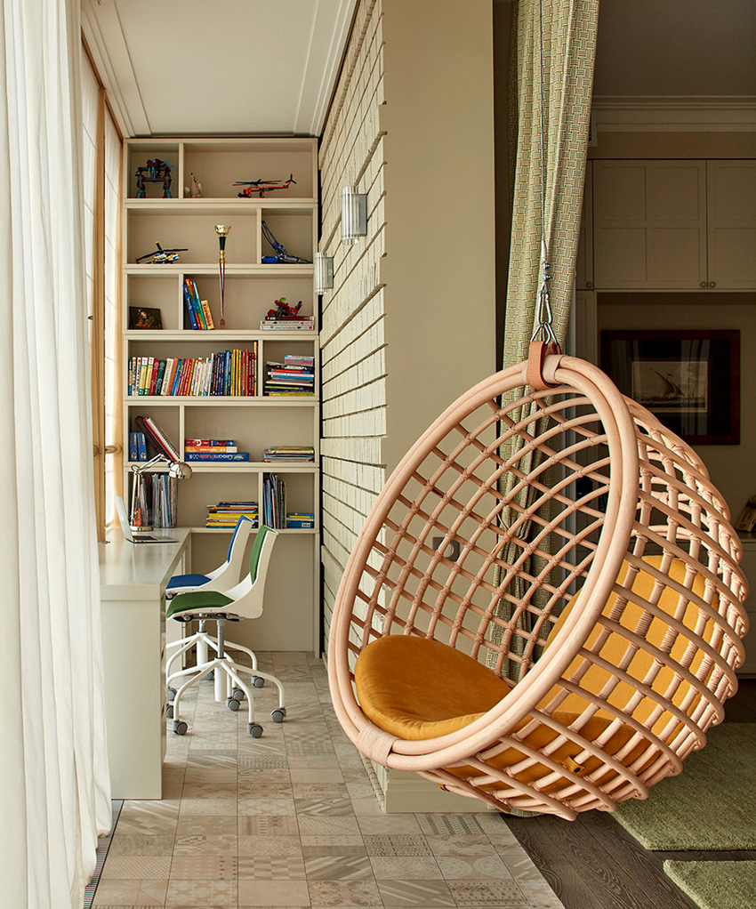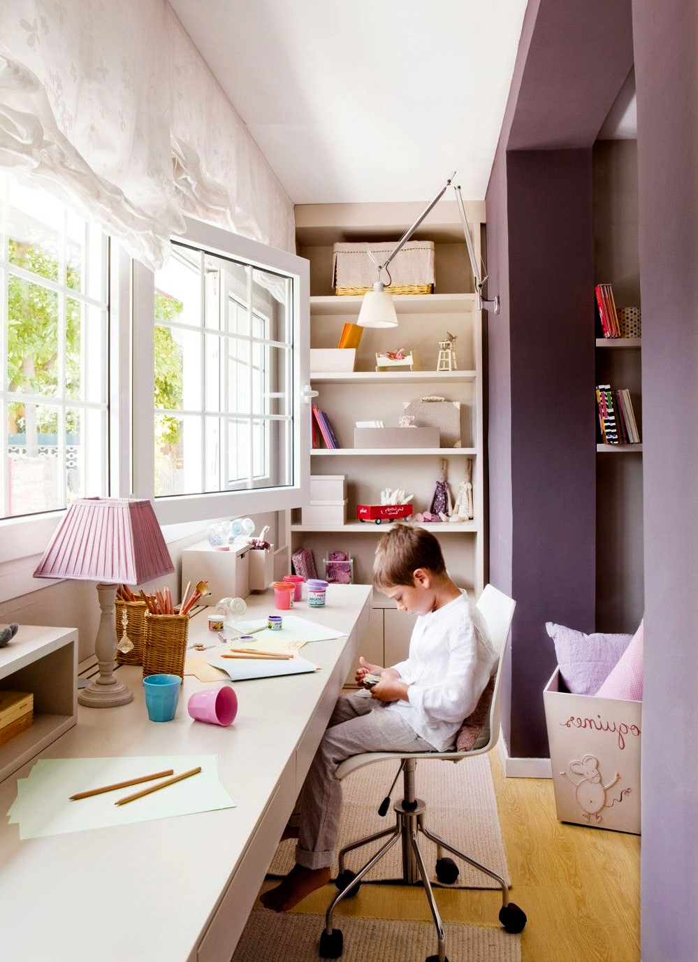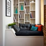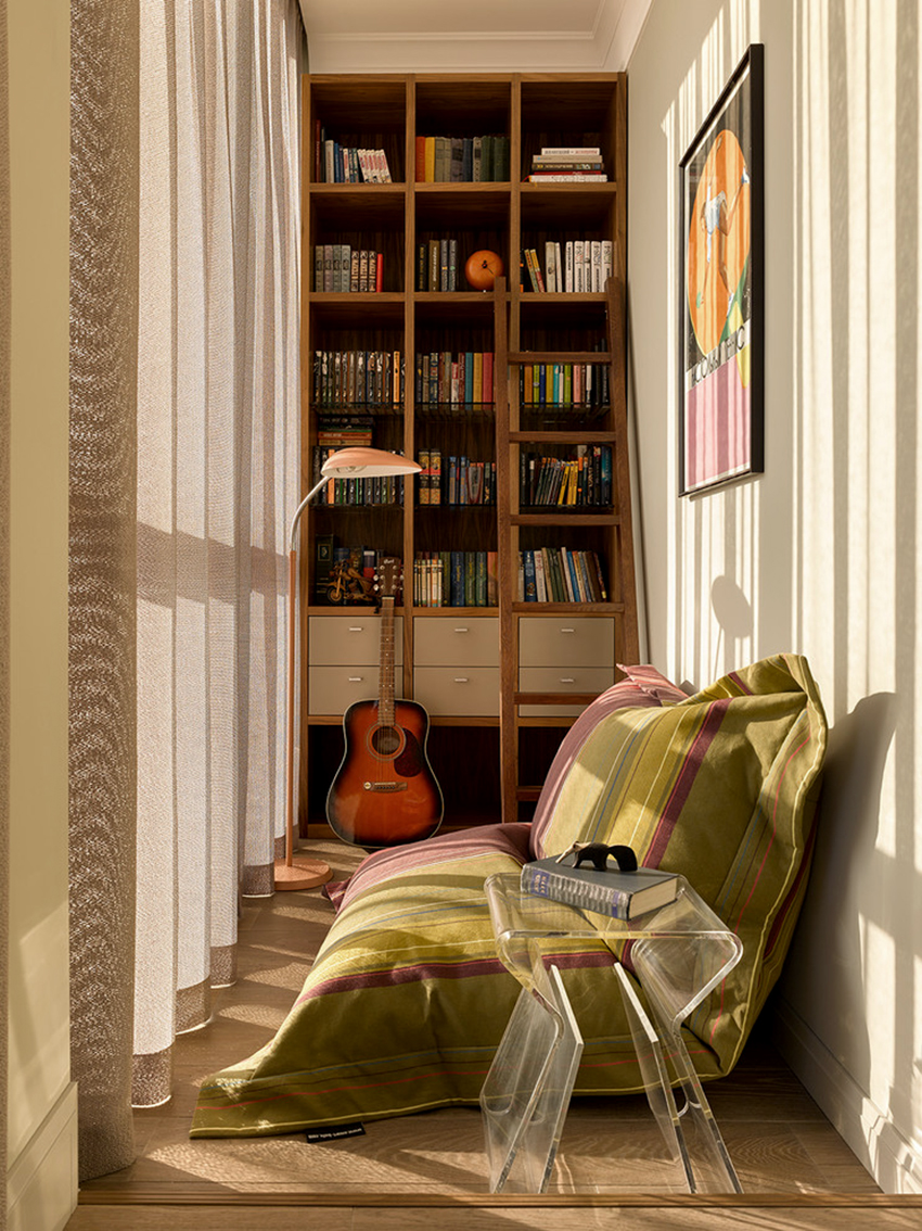 - Meja sisi katil yang luas yang memakan semua ruang di bawah ambang tingkap. Hampir tidak kelihatan, tetapi pada masa yang sama sangat lapang.