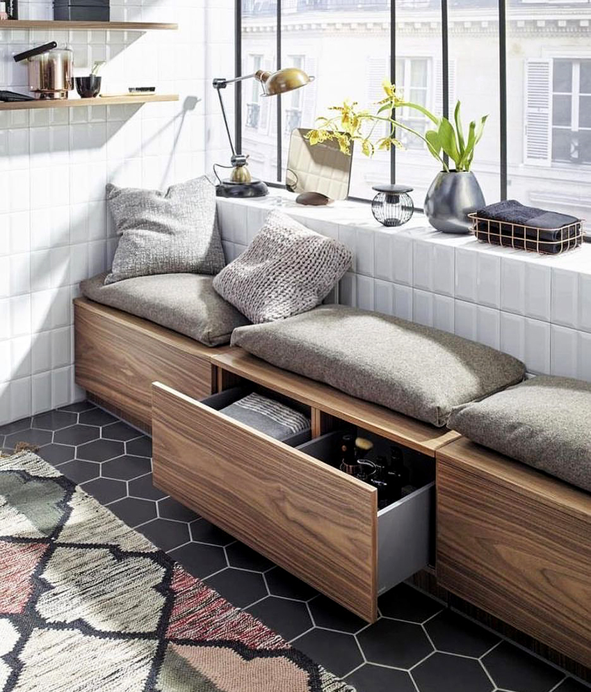 - Sofa Curbstone.Ia dipasang di bawah ambang tingkap, dilengkapi dengan pintu berengsel dua sayap atau penutup atas. Sekiranya anda melempar bantal lembut di tingkat atas, strukturnya akan berfungsi sebagai tempat yang bagus untuk berehat pada hari yang cerah.