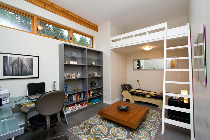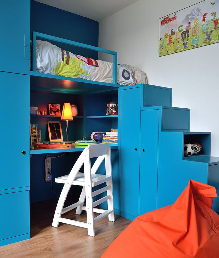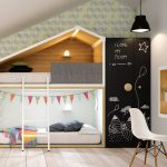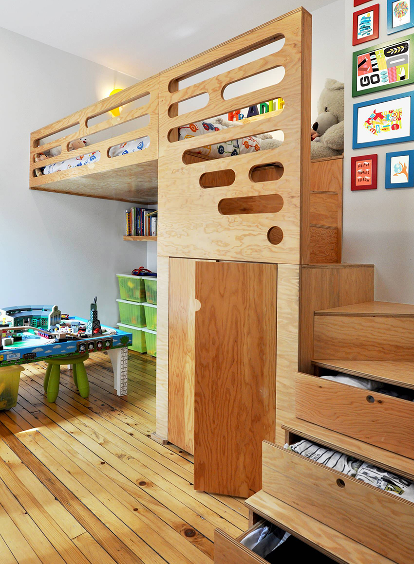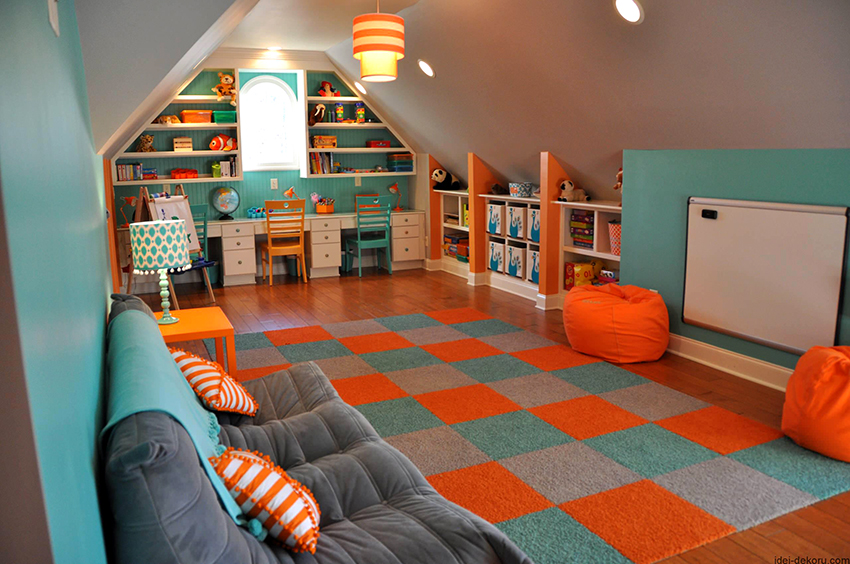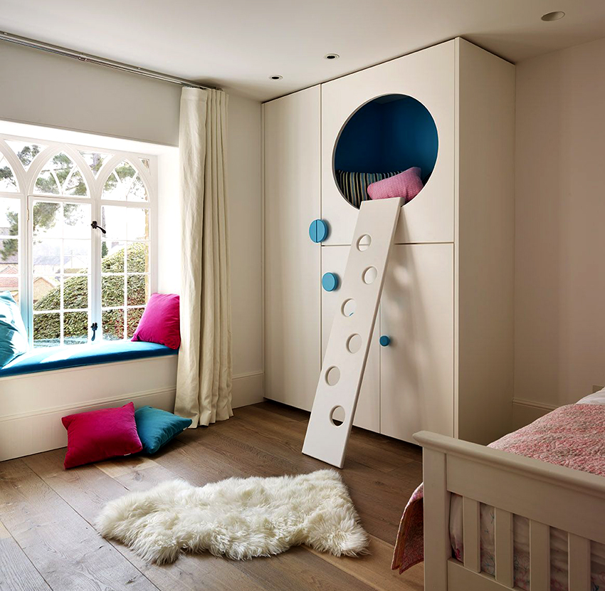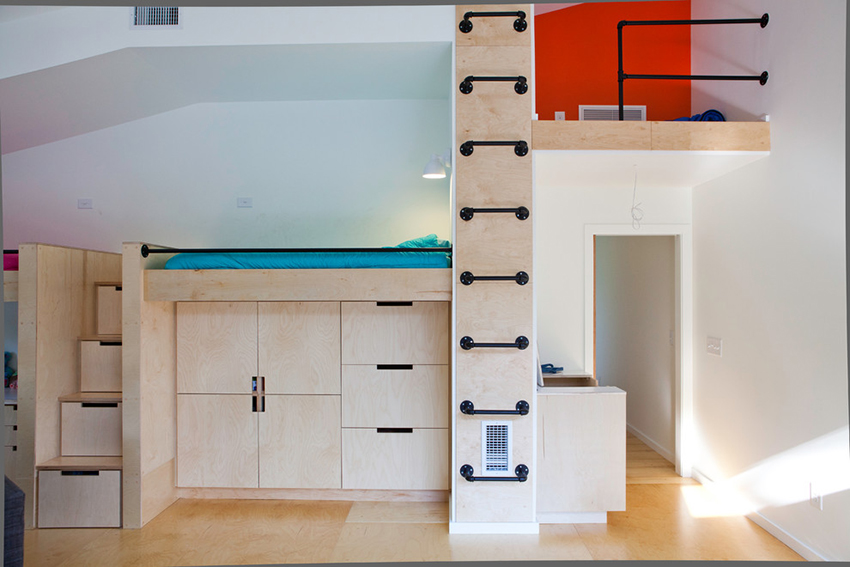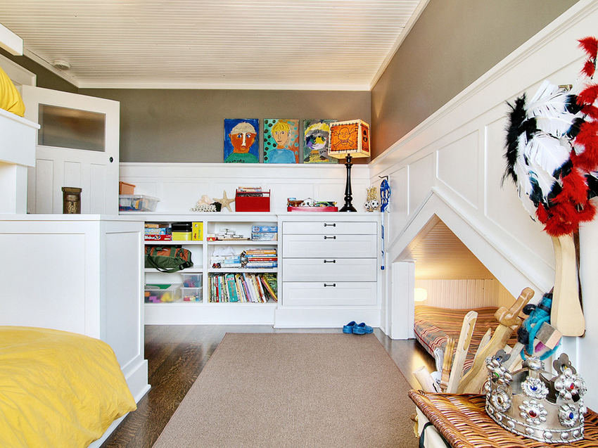 Pilihan yang mudah adalah memasang kabinet mainan di bawah katil loteng - kanak-kanak mempunyai perasaan berada di rumah yang selesa.