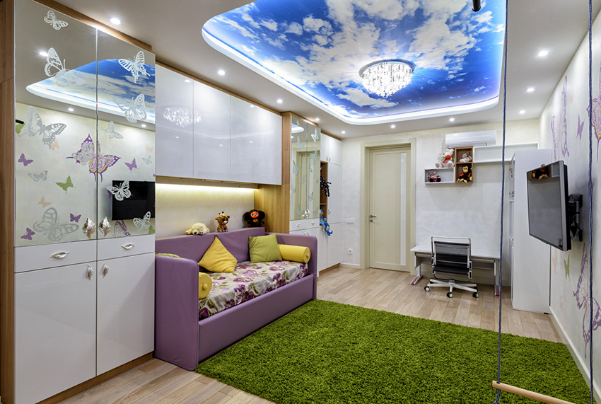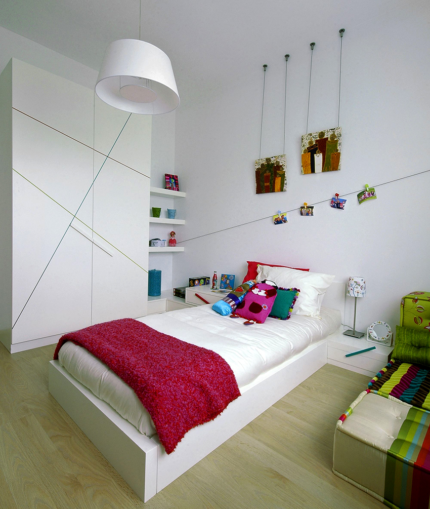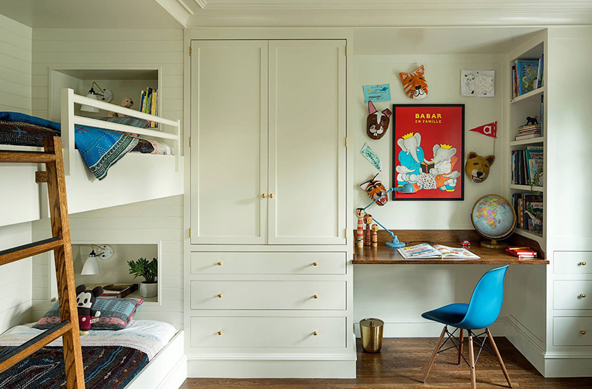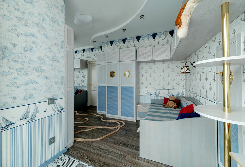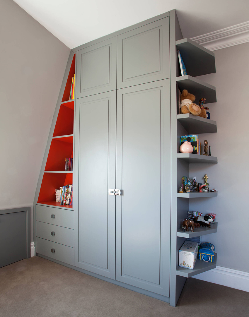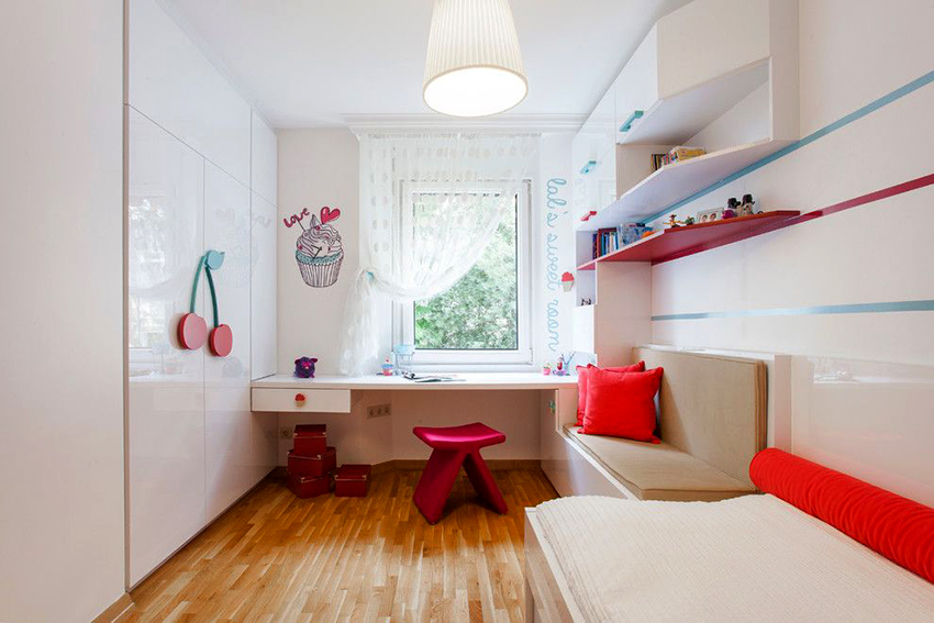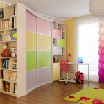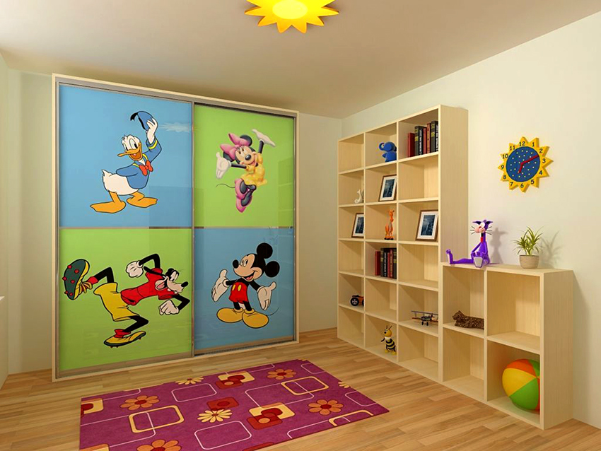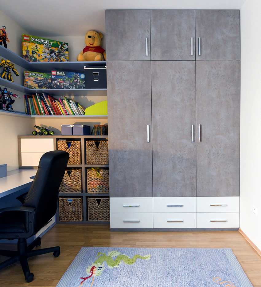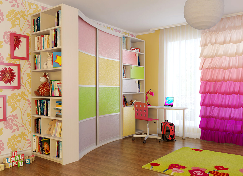 Struktur terbina dalam yang paling popular di bilik kanak-kanak adalah almari pakaian. Ia dapat menempati ceruk, partisi, bagian sudut, atau dapat dipasang di antara dinding, mulai dari langit-langit hingga lantai. Pilihan ini paling sesuai untuk bilik segi empat, di mana panjang dinding tegak lurus mempunyai perbezaan yang ketara. Pintu kabinet seperti itu sering tergelincir - pintu swing hanya digunakan untuk model bersaiz kecil yang terbina dalam.