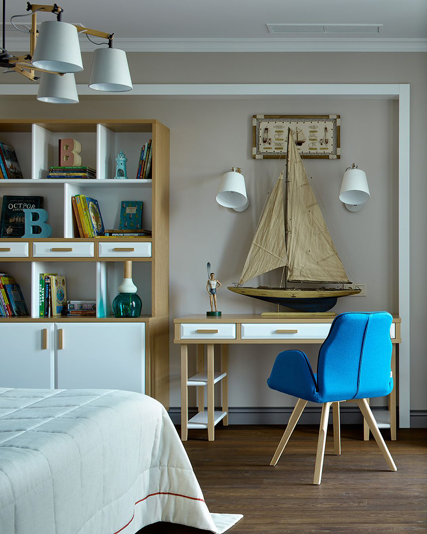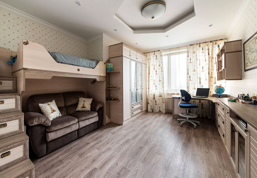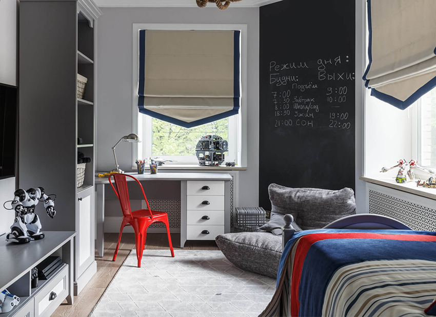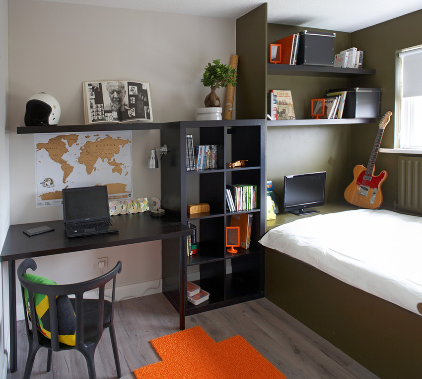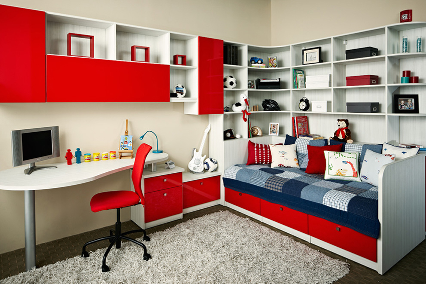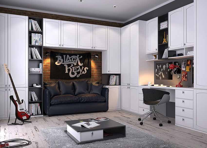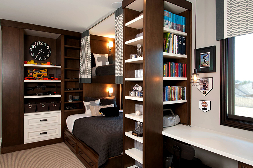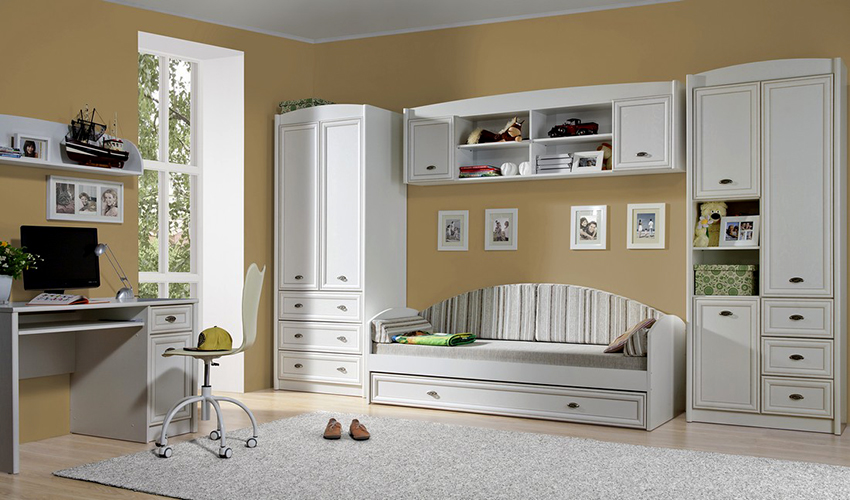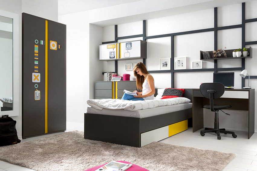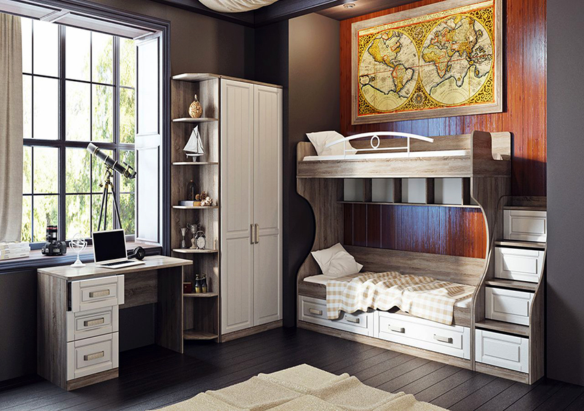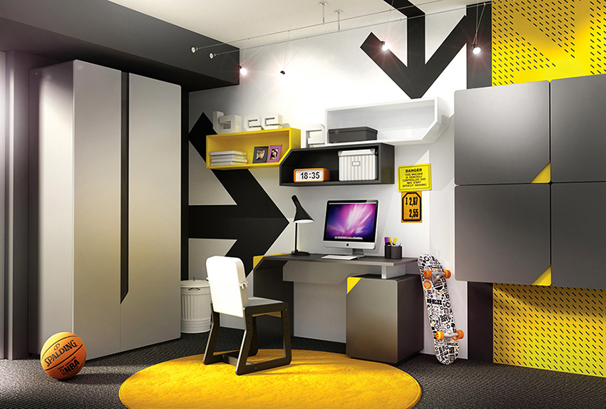 Ciri reka bentuk - minimum warna yang mengganggu, kesederhanaan, singkat. Sekiranya, demi dalaman, kabinet dikeluarkan dengan ketara dari tempat penggunaan langsung kandungannya, remaja cenderung memindahkannya. Lelaki, walaupun pada masa kanak-kanak, lebih suka semua yang ada.