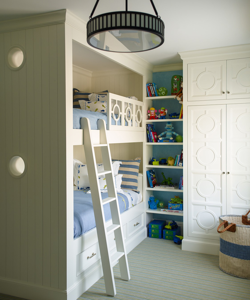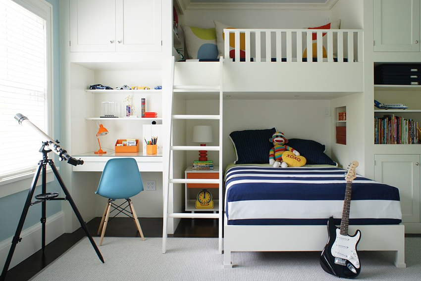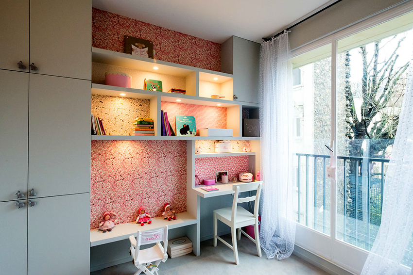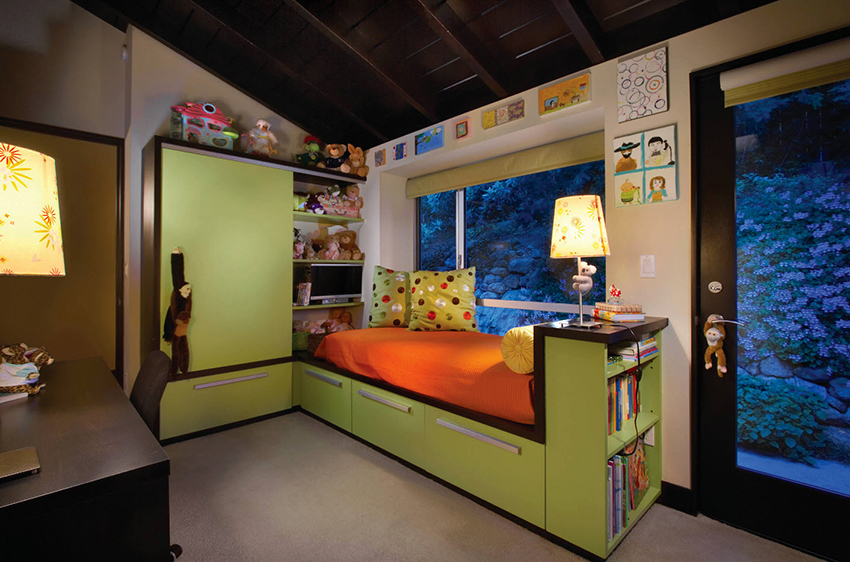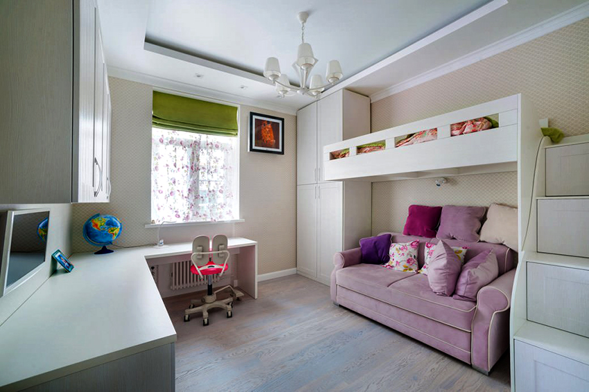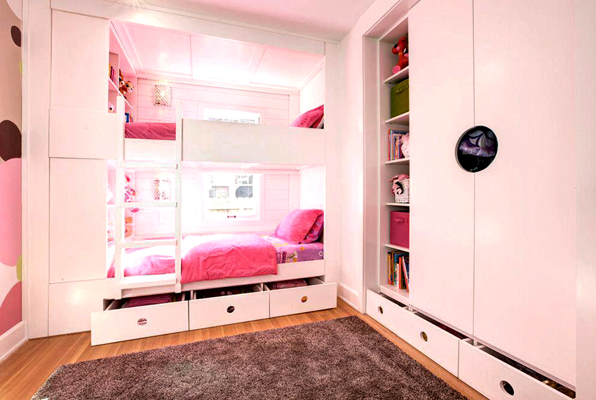 Dalam reka bentuk bilik kanak-kanak, perabot terbina dalam semakin banyak digunakan. Masa telah menunjukkan bahawa ciri prestasinya kadangkala jauh lebih tinggi daripada perabot kabinet klasik. Keunikan perabot ini adalah bahawa ia tidak mempunyai dinding sisi, dan kadang-kadang tidak mempunyai siling atas. Mereka digantikan oleh panel palsu, yang biasanya tidak berfungsi secara teknikal tetapi fungsi estetik. Antara kelebihan utama yang perlu diketengahkan: