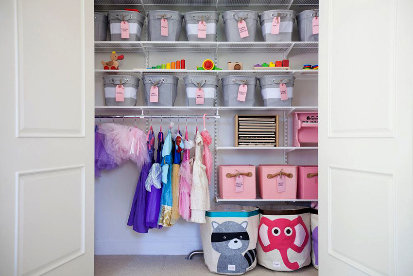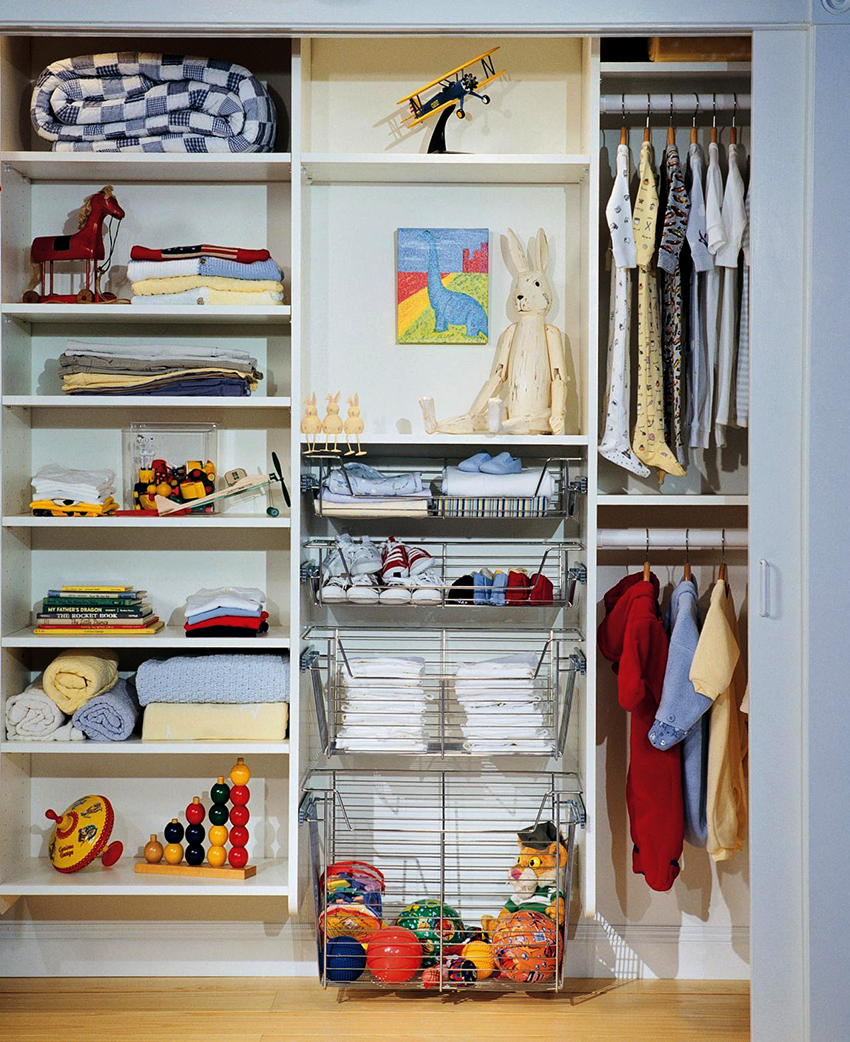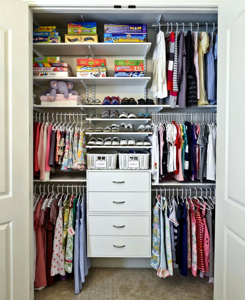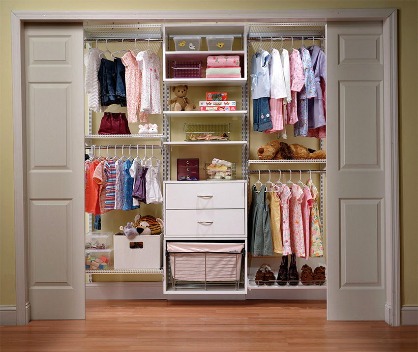 Anda boleh meletakkan di almari pakaian bukan sahaja pakaian dan kasut, tetapi juga tempat tidur, mainan lembut, peralatan pejabat. Ini betul dari sudut sanitasi (objek tidak akan terkumpul habuk), dan untuk alasan estetik (tidak semua perkara yang kanak-kanak gunakan dalam kehidupan seharian harus tetap terbuka).