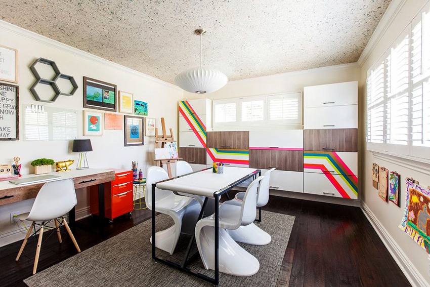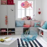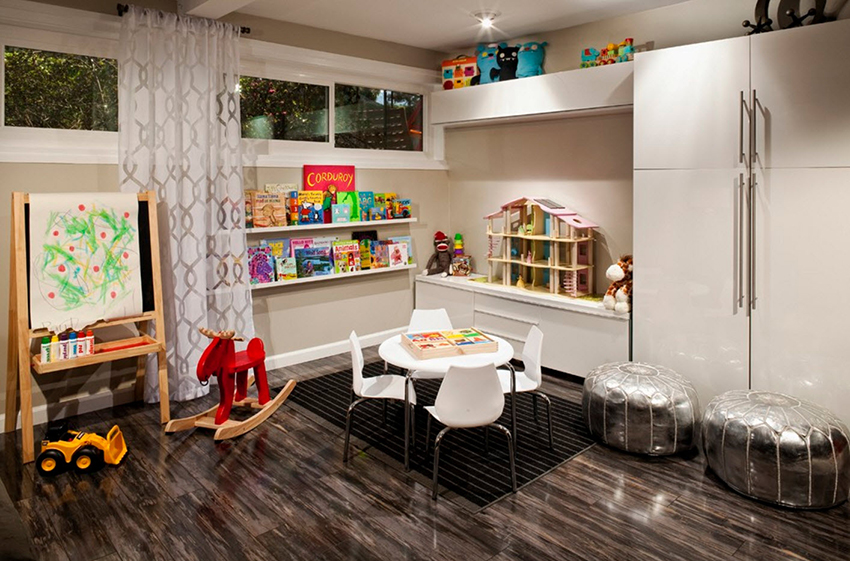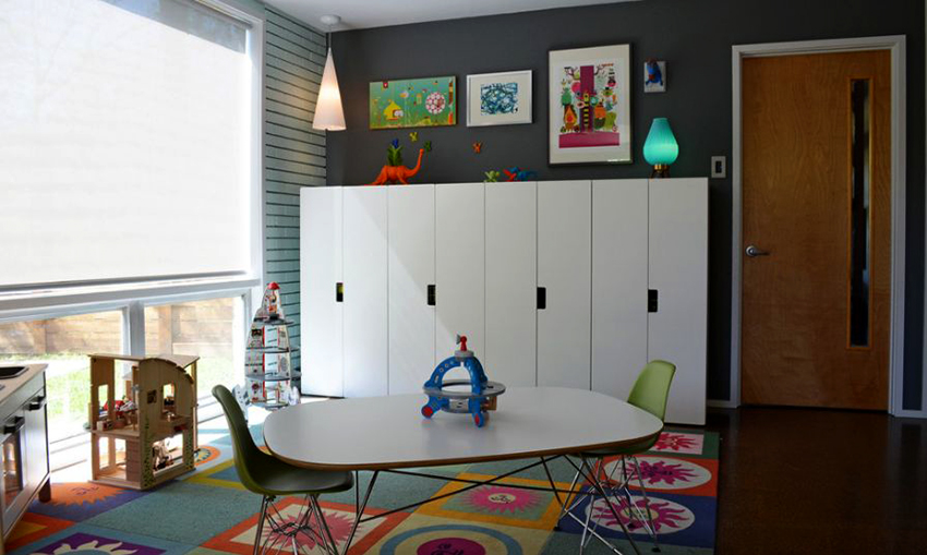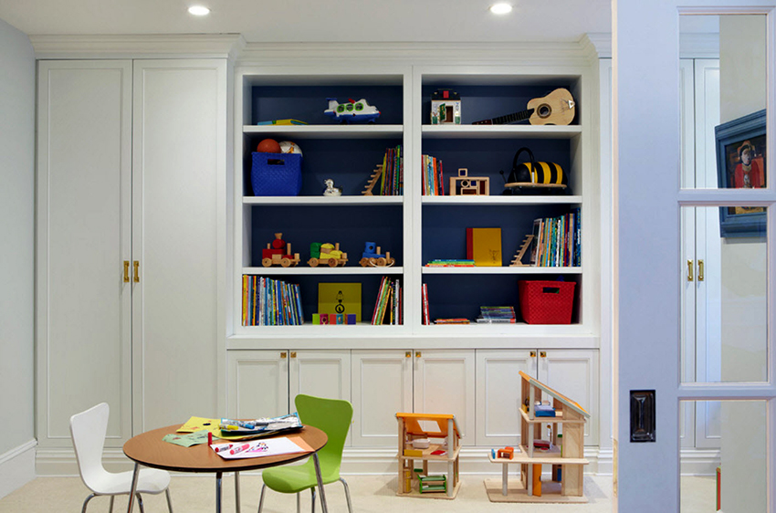 Sekiranya kabinet mainan dibeli secara berasingan dari perabot yang lain dan berbeza dari segi kualiti bahan, warna warna, perlu meletakkannya di kedalaman ruang permainan, dikelilingi oleh perincian yang membuat reka bentuk menarik untuk zon terpisah.