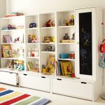 Tidak mungkin menyenaraikan semua pilihan. Anak-anak boleh menggunakan perabot jenis ini, kerana semua objek terbuka, tidak perlu mencarinya. Foto rak di bilik kanak-kanak di laman kedai dalam talian menunjukkan pilihan menarik untuk reka bentuk modular apabila rak dipasang dari kubus. Model dengan sokongan sisi menghiasi bahagian dalam dengan sempurna, di mana rak dengan pengancing cantilever dipasang. Selalunya, unit rak adalah sebahagian daripada komposisi perabot yang terdiri daripada elemen perabot kabinet.