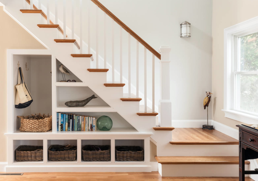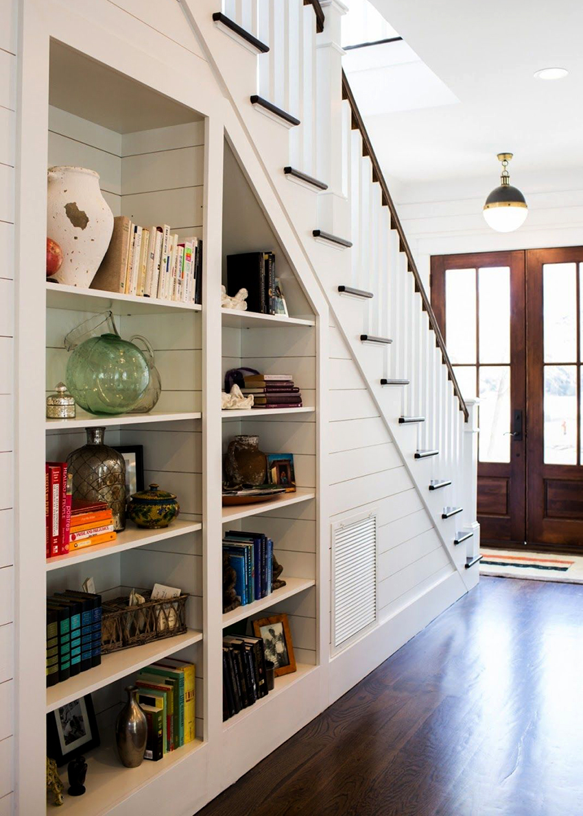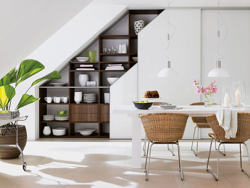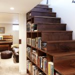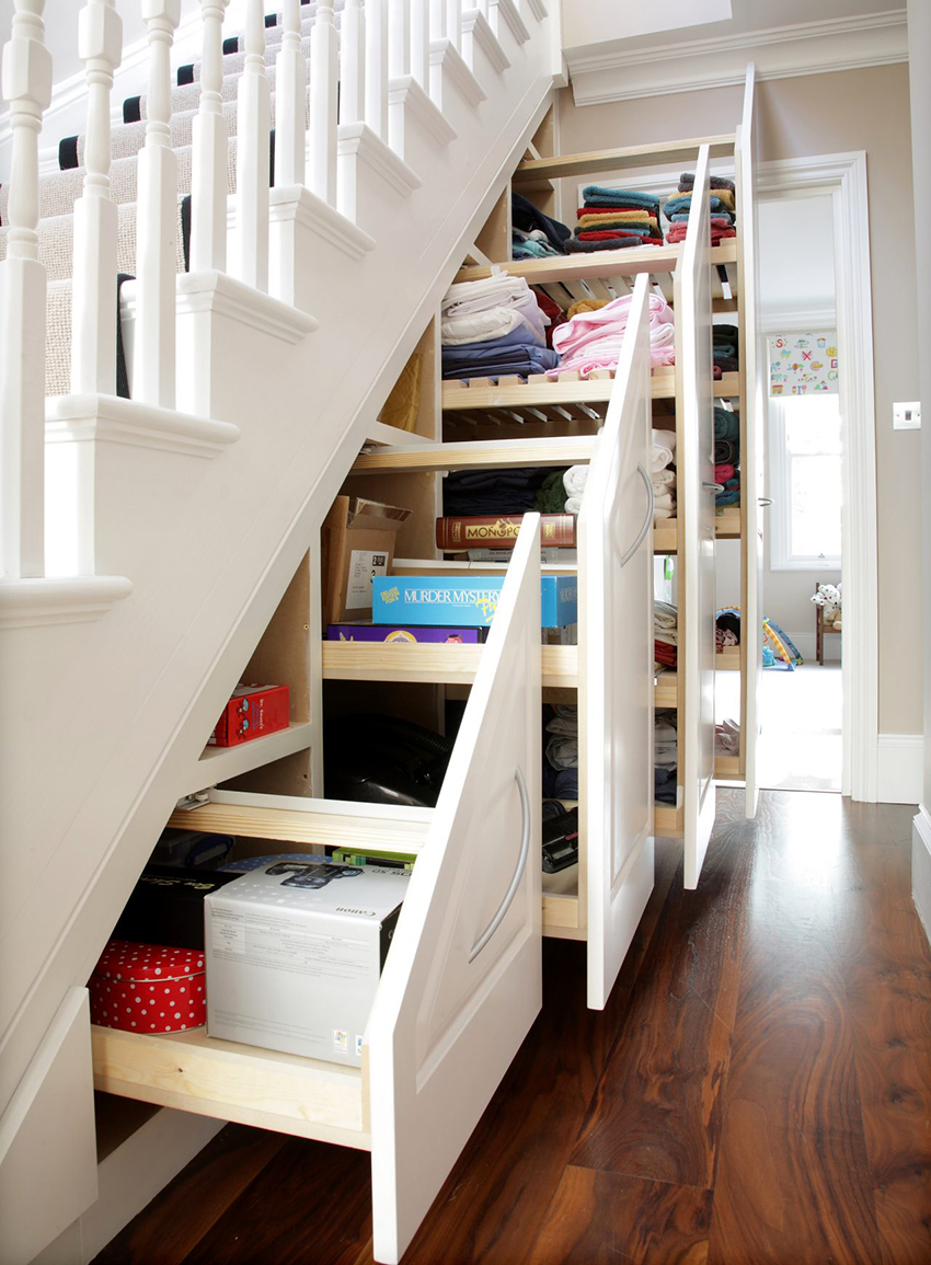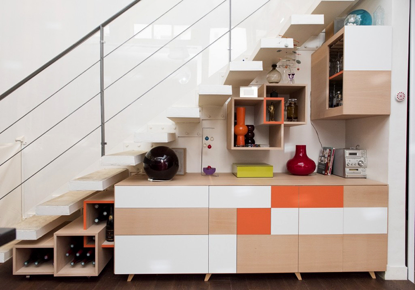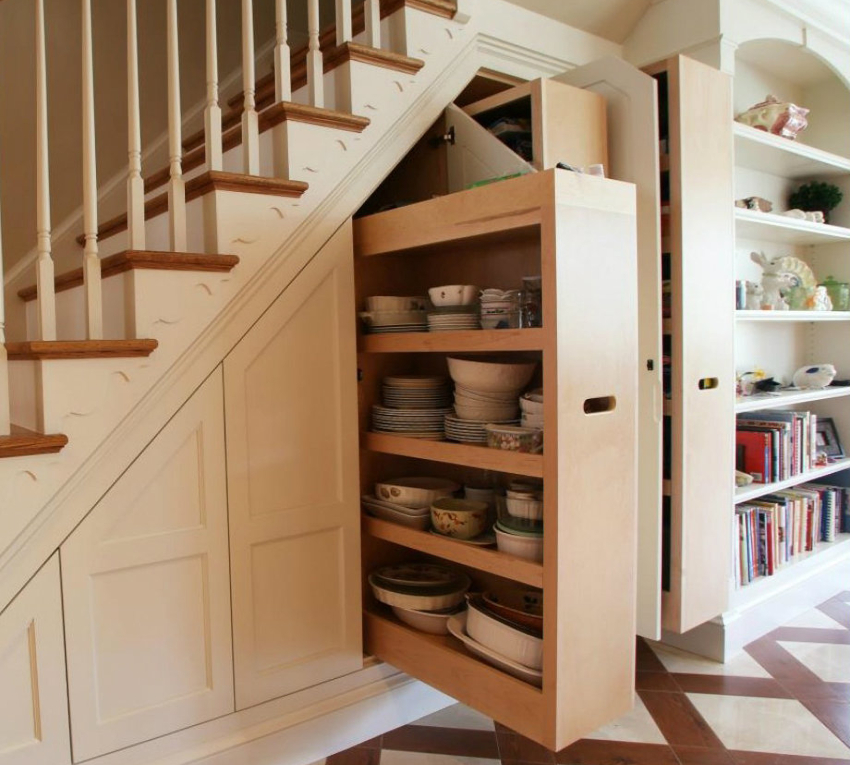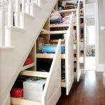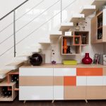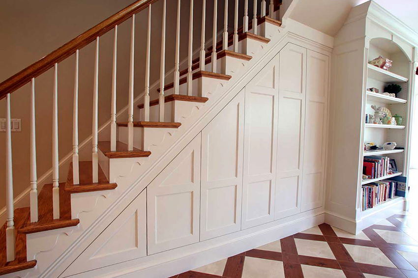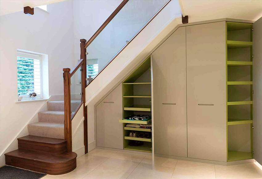 Sekiranya kawasan di bawah tangga besar, anda boleh memasang kabinet dan rak pelbagai jenis struktur.