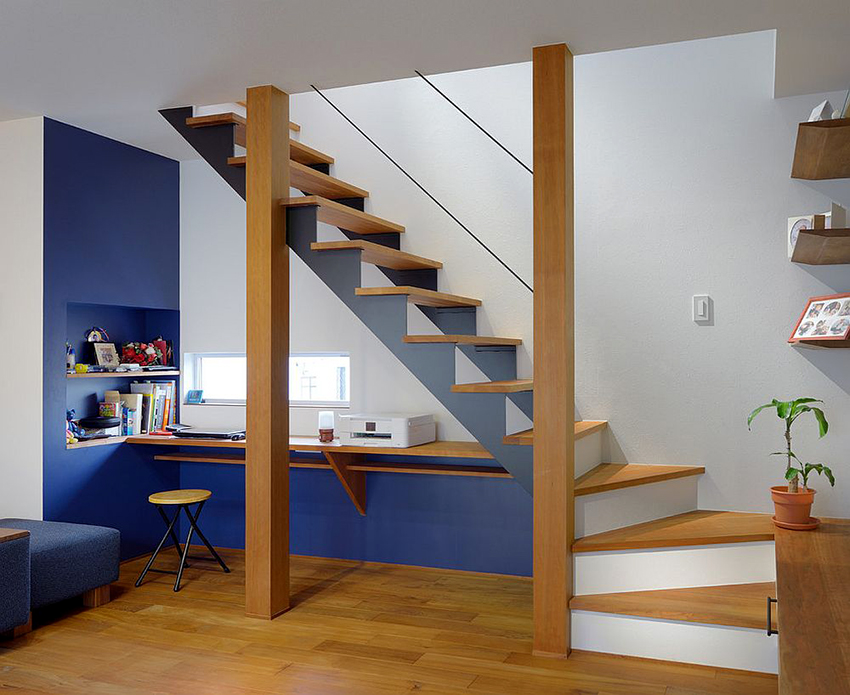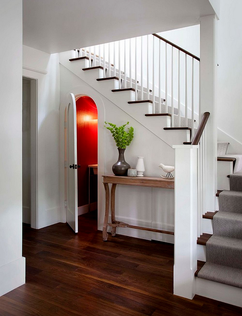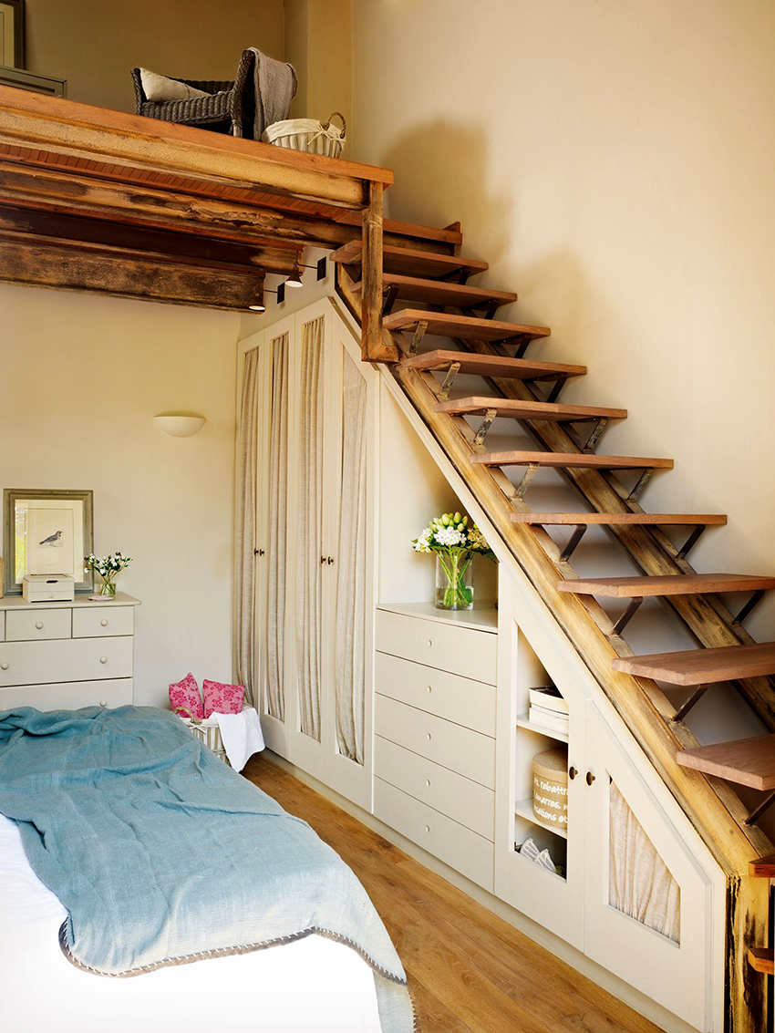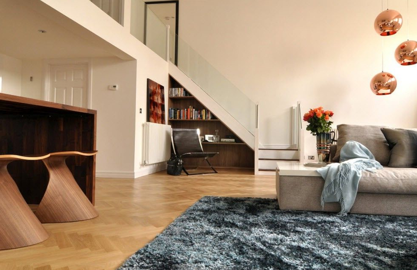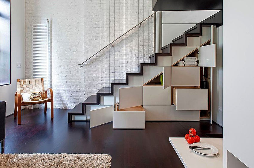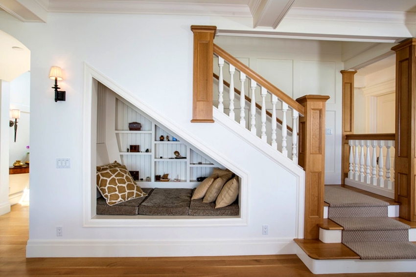 Tidak jarang para pereka menggunakan ruang di bawah tangga untuk membuat ruang yang terpisah. Sudah tentu, bilik dalam kes ini merangkumi bilangan perabot minimum.