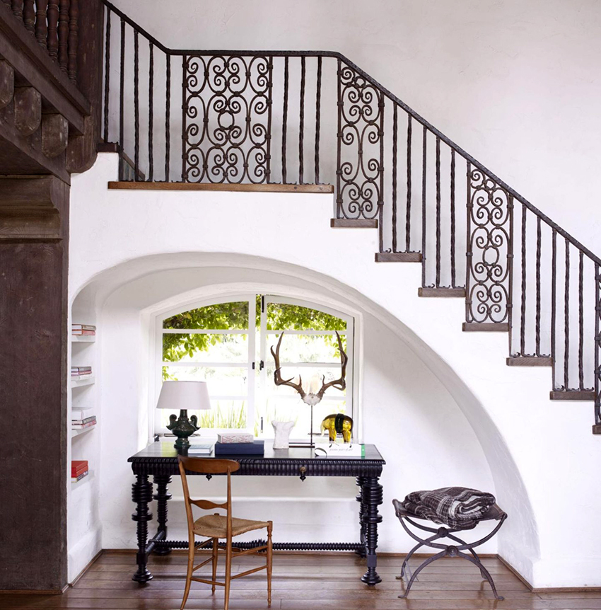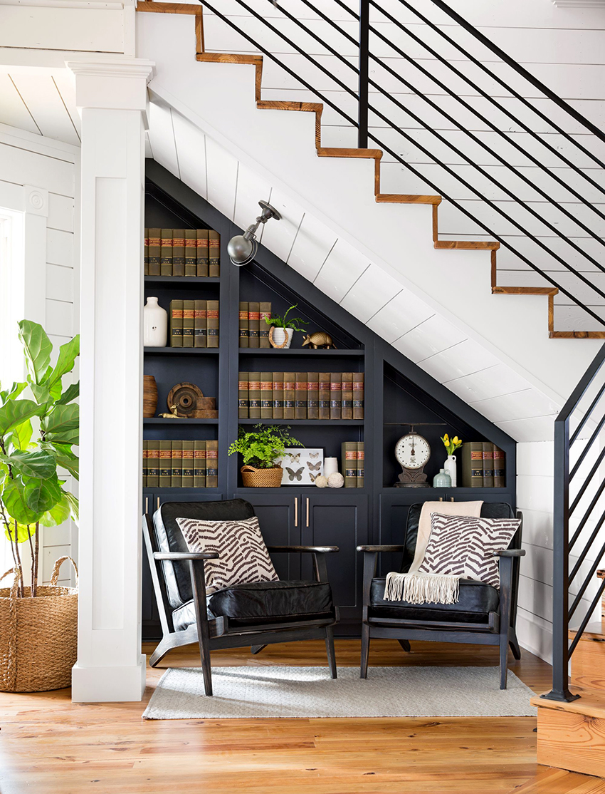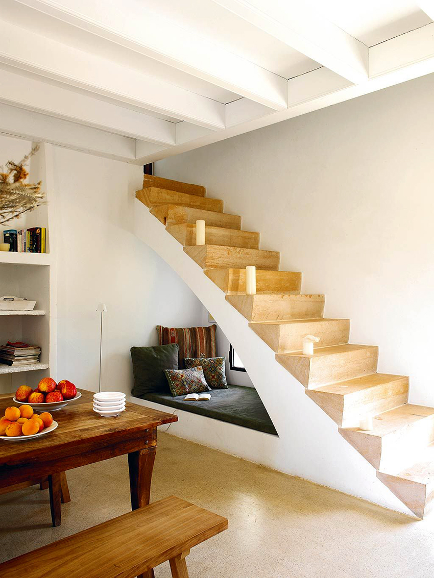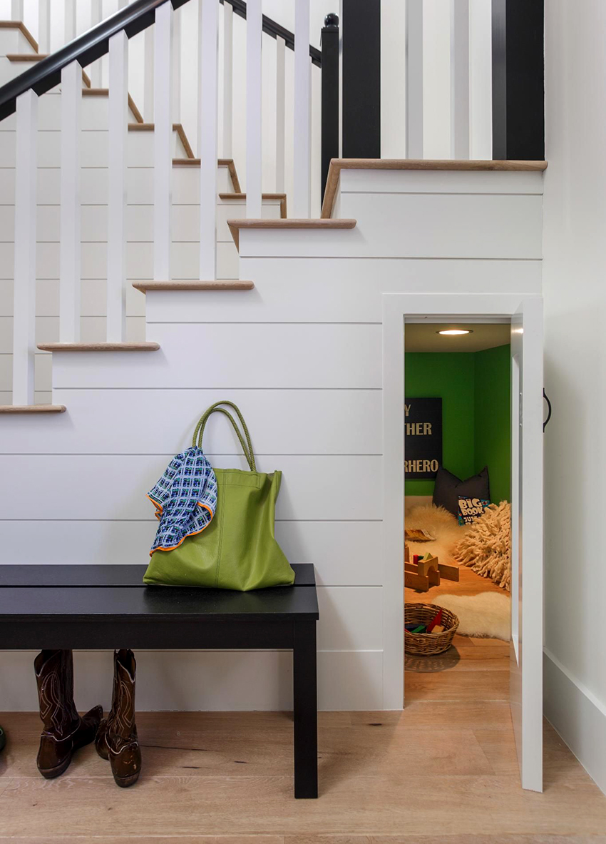 Tidak jarang para pereka menggunakan ruang di bawah tangga untuk membuat ruang yang terpisah. Sudah tentu, bilik dalam kes ini merangkumi bilangan perabot minimum.