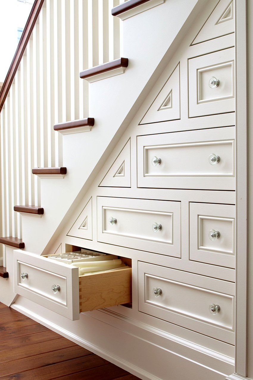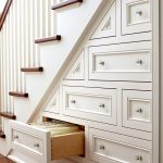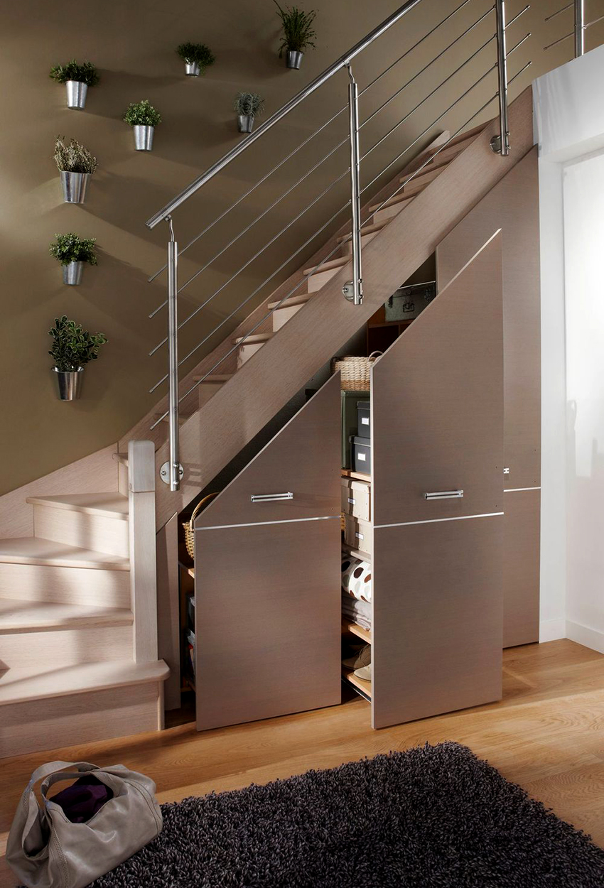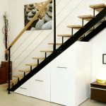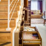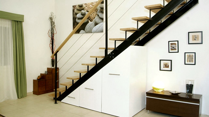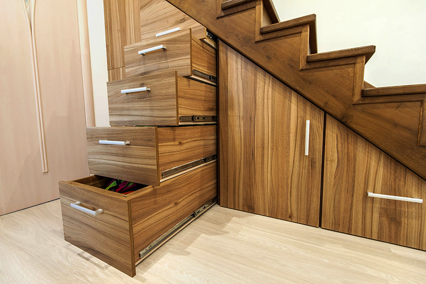 Untuk menjaga ketertiban di dalam almari dan untuk memudahkan mencari barang, bahagian depan laci ditandatangani. Sekiranya lebar tangga melebihi 0,6 m, dua atau tiga ruang perabot dengan kapasiti besar akan sesuai di bawahnya. Masing-masing dibahagikan kepada beberapa bahagian dengan laci dan rak.