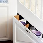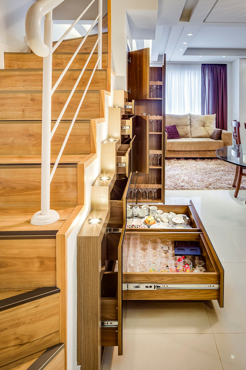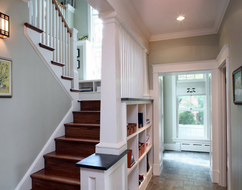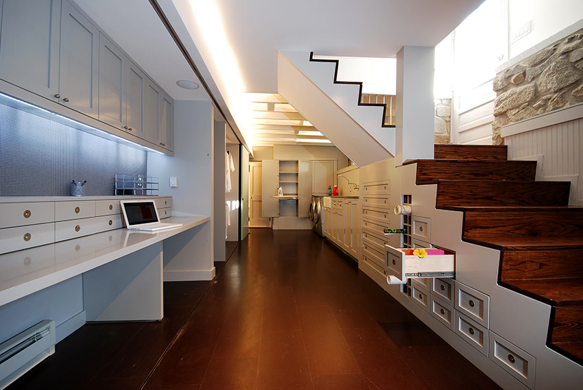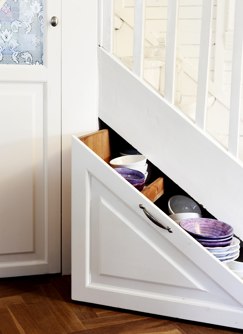 Untuk menjaga ketertiban di dalam almari dan untuk memudahkan mencari barang, bahagian depan laci ditandatangani. Sekiranya lebar tangga melebihi 0,6 m, dua atau tiga ruang perabot dengan kapasiti besar akan sesuai di bawahnya. Masing-masing dibahagikan kepada beberapa bahagian dengan laci dan rak.
