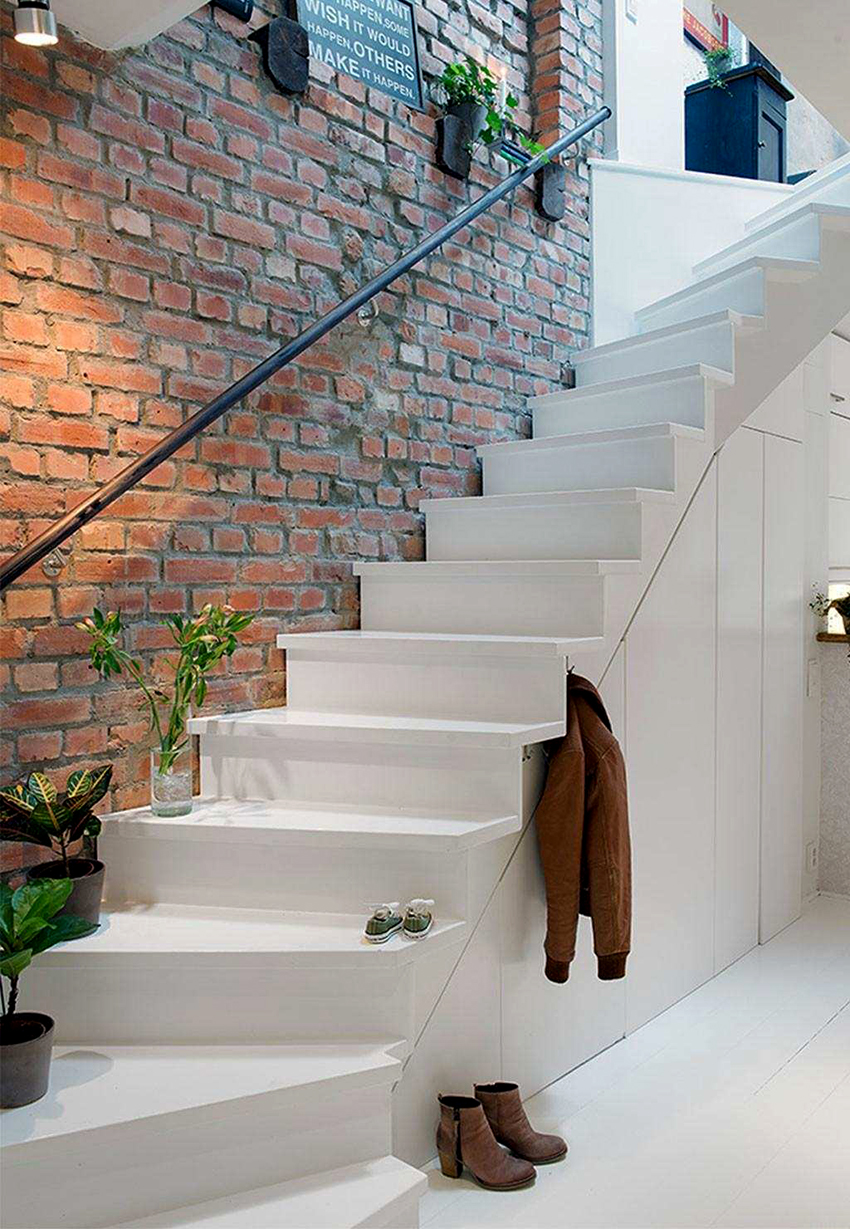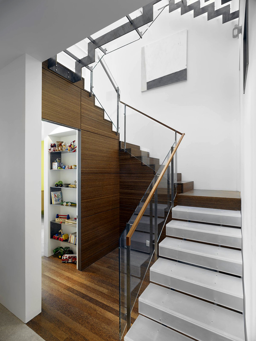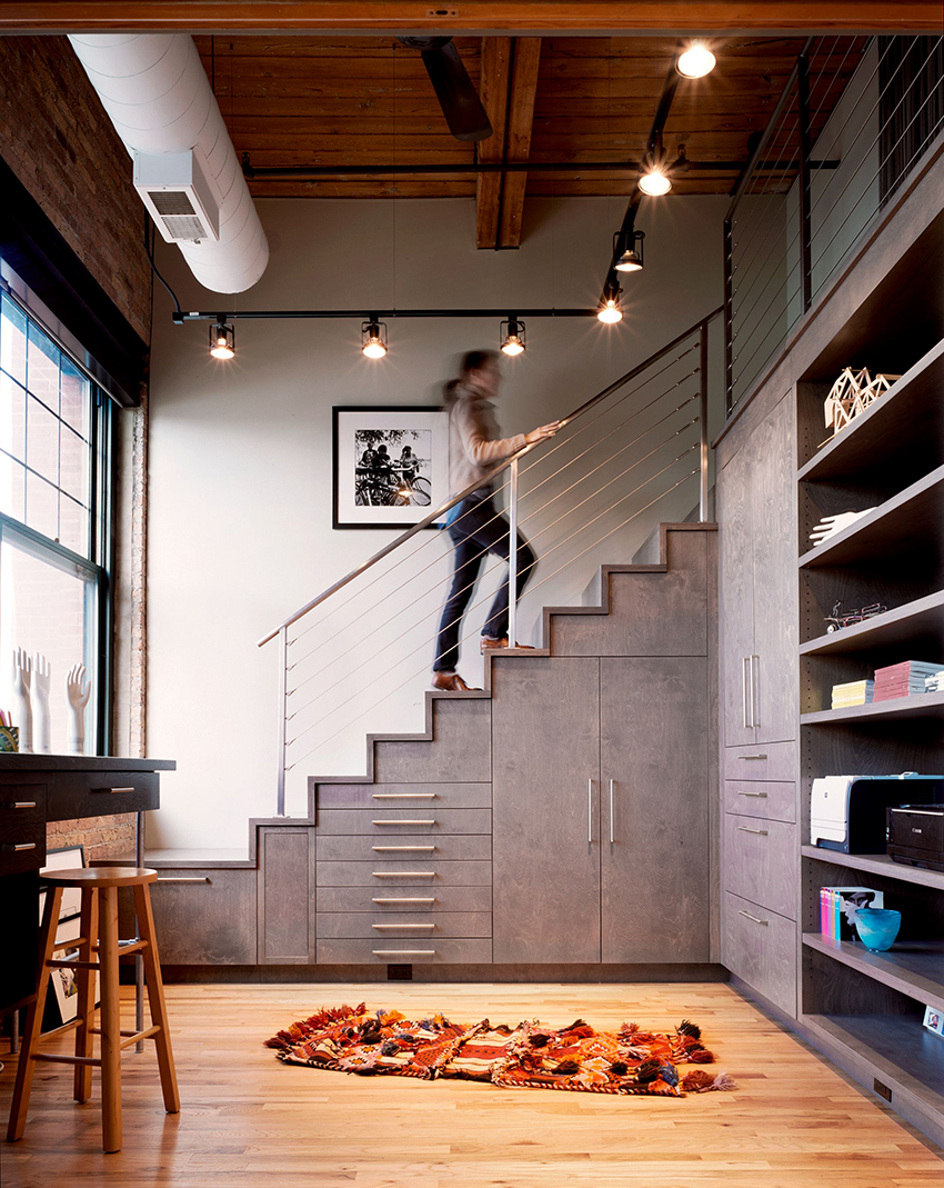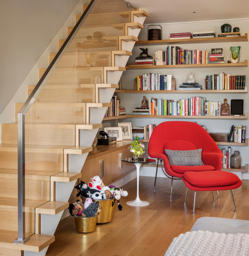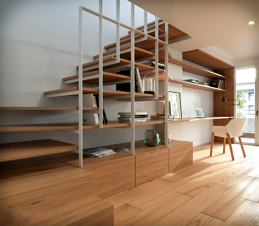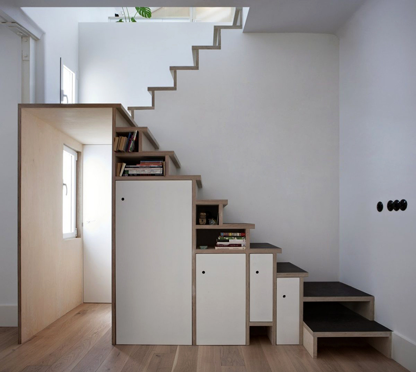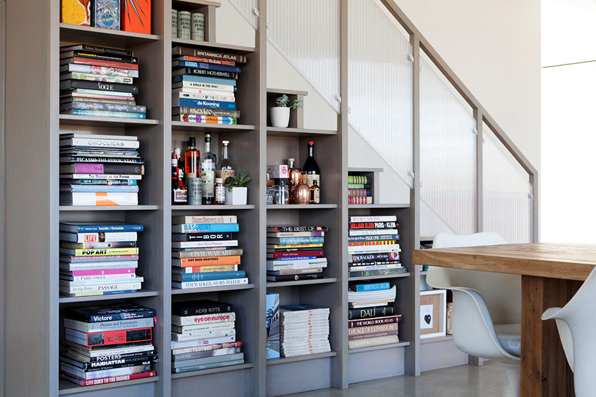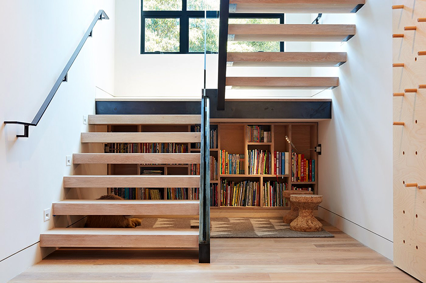 Berkat gabungan rak terbuka yang bijak dengan jenis struktur lain, tangga dapat ditenangkan.