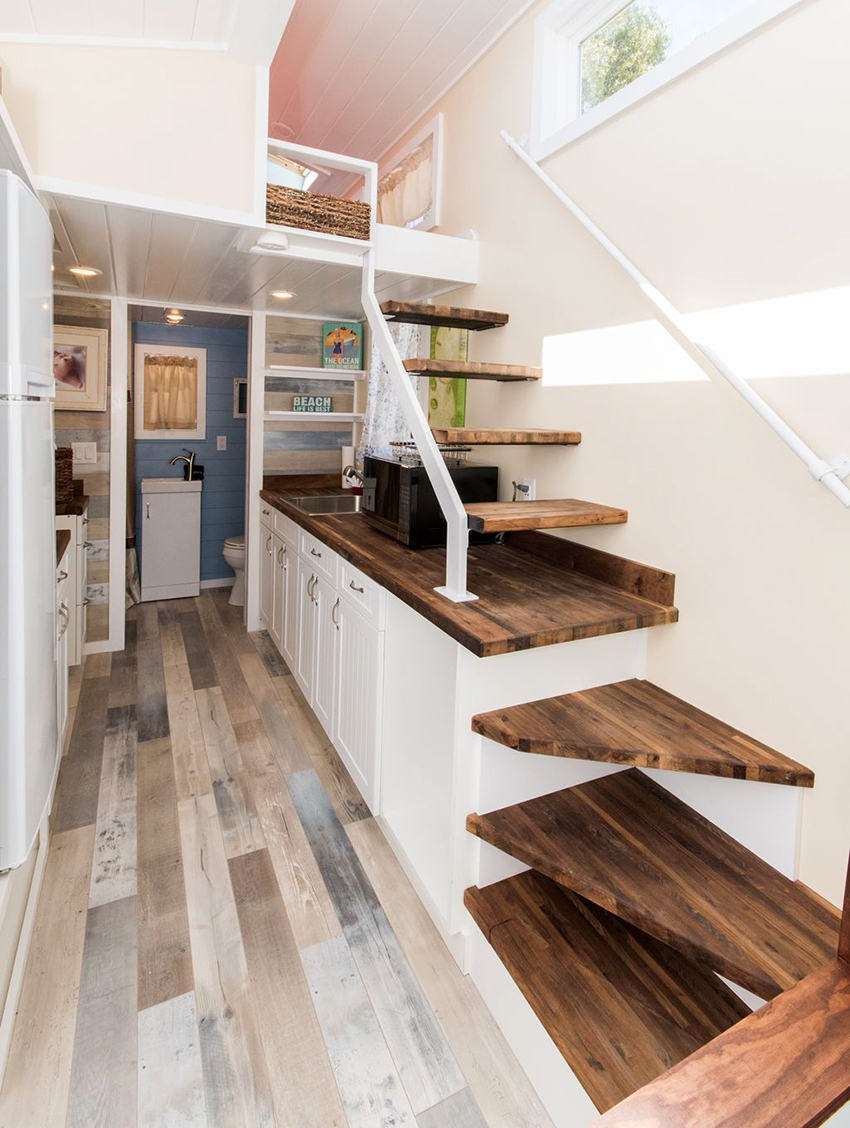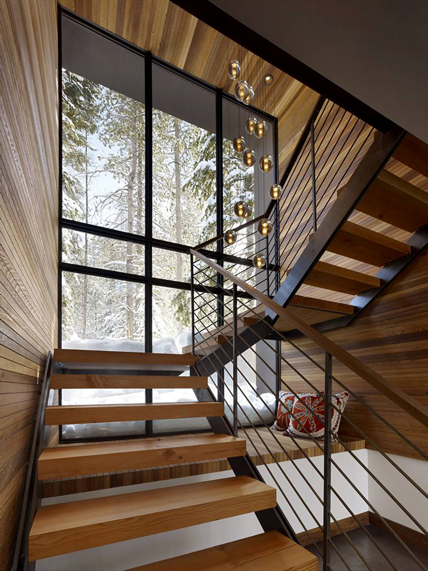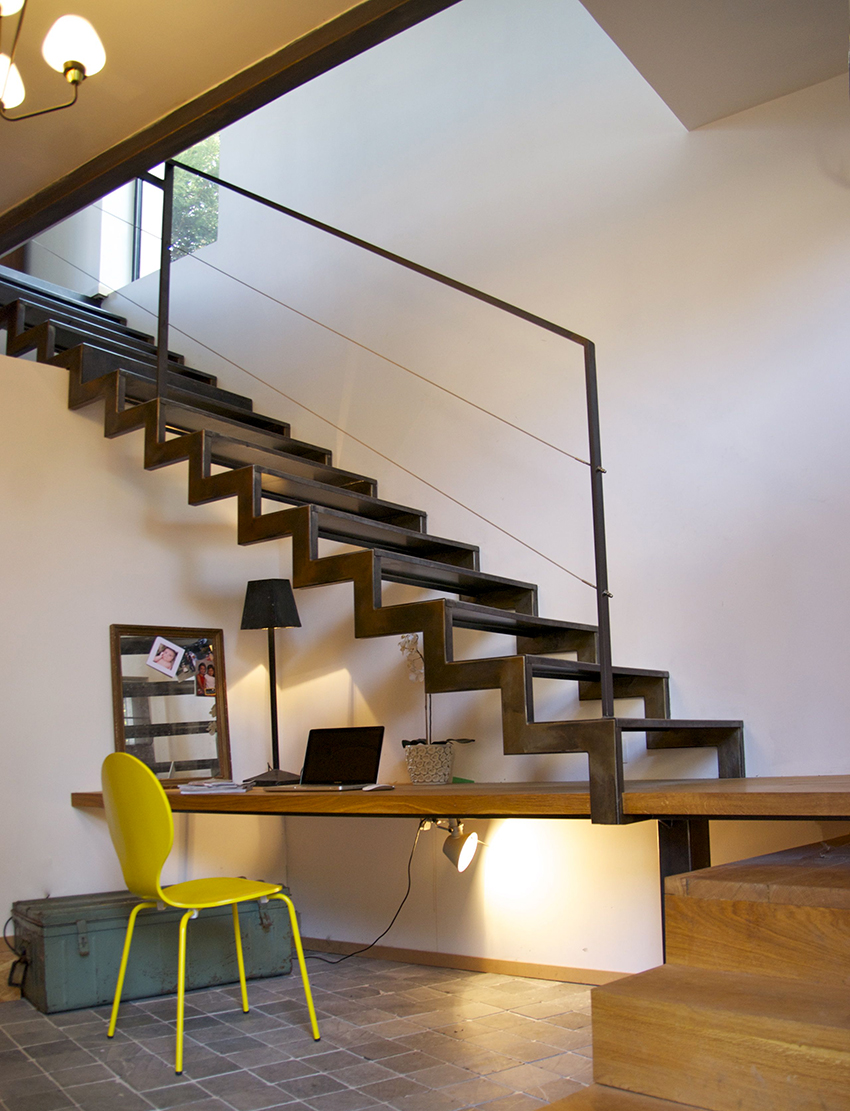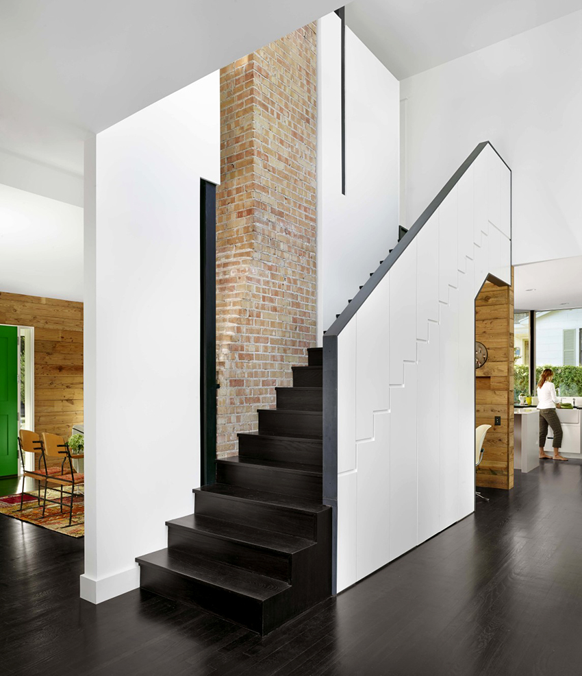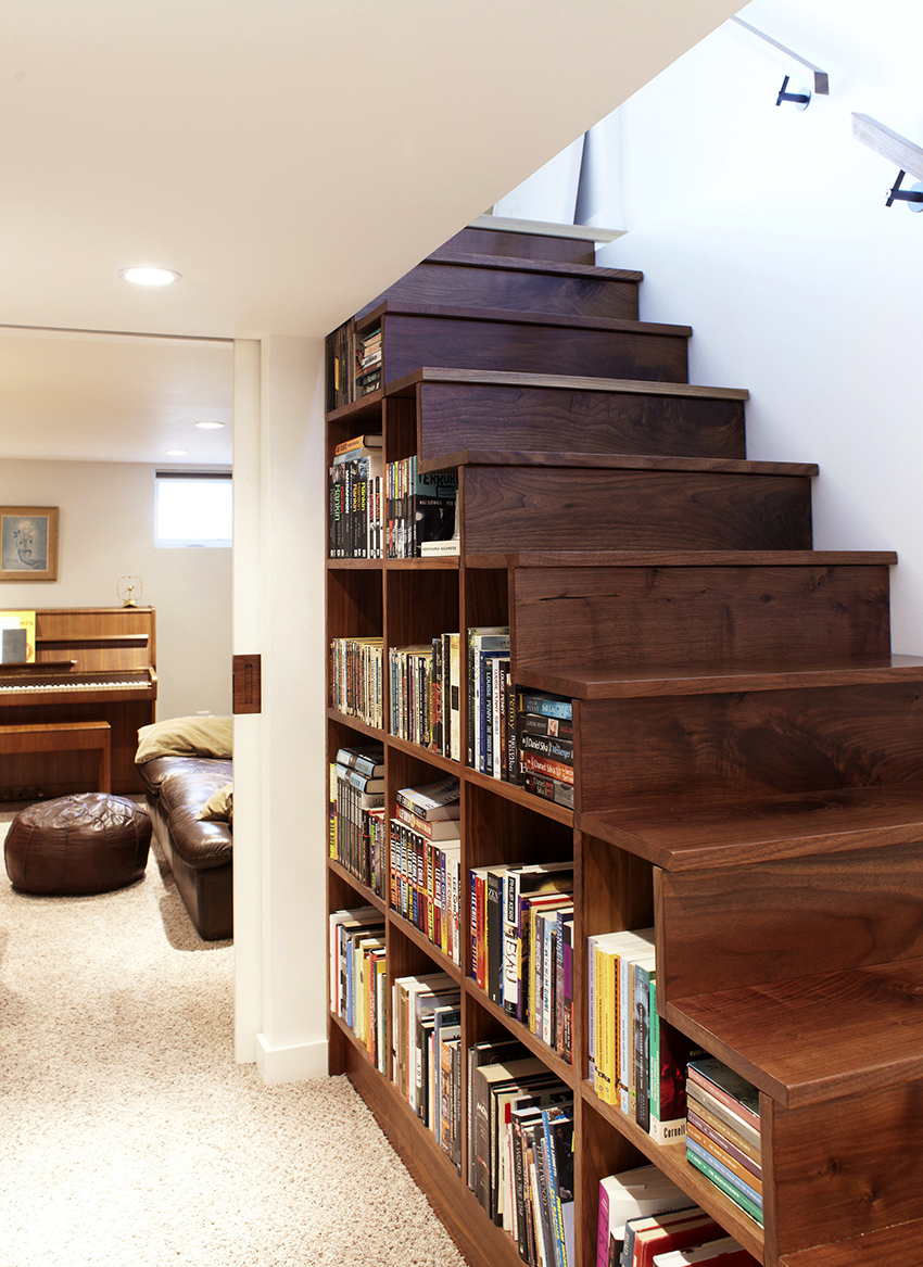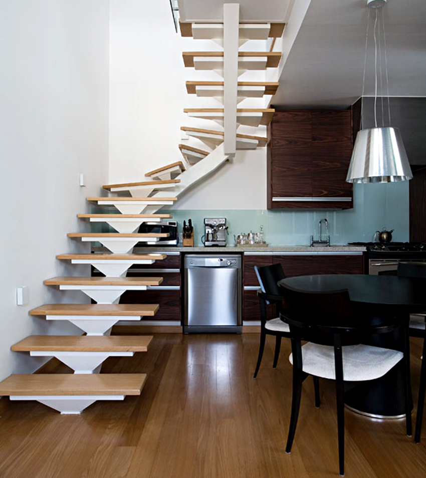 Berkat gabungan rak terbuka yang bijak dengan jenis struktur lain, tangga dapat ditenangkan.