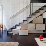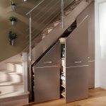 Untuk membuat ruang ergonomik di bawah tangga, anda boleh memasang almari pakaian, reka bentuknya terdiri daripada laci. Unsur-unsur ini bergerak bebas berkat panduan roller. Dalam kes ini, tiada kerosakan mekanikal di lantai.